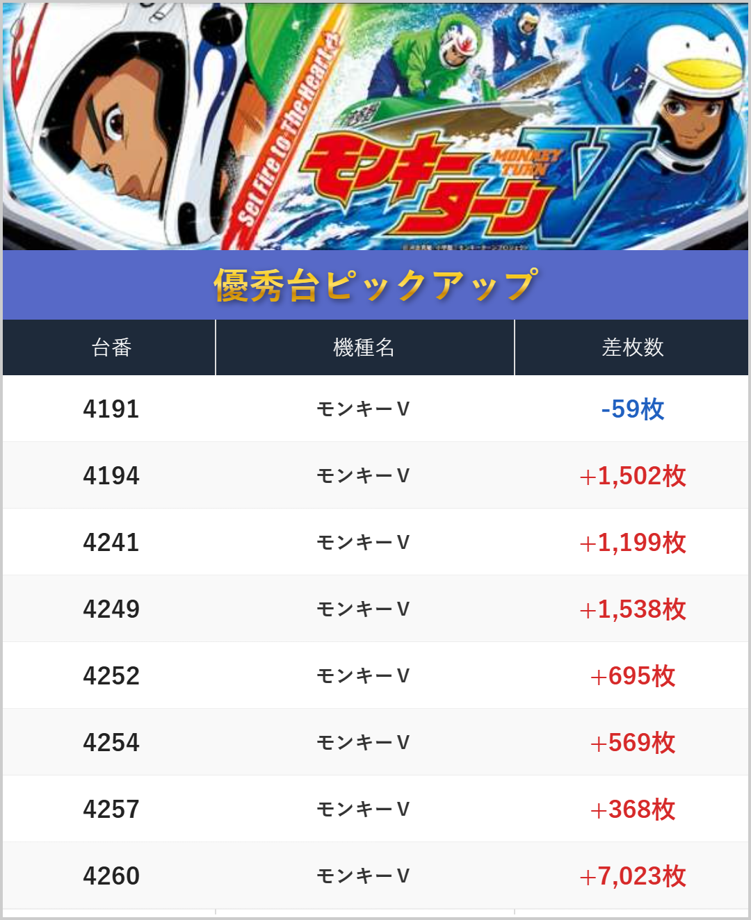山佐のメイン機種【モンキーⅤ】には好調台多数&トロフィー報告アリ。
