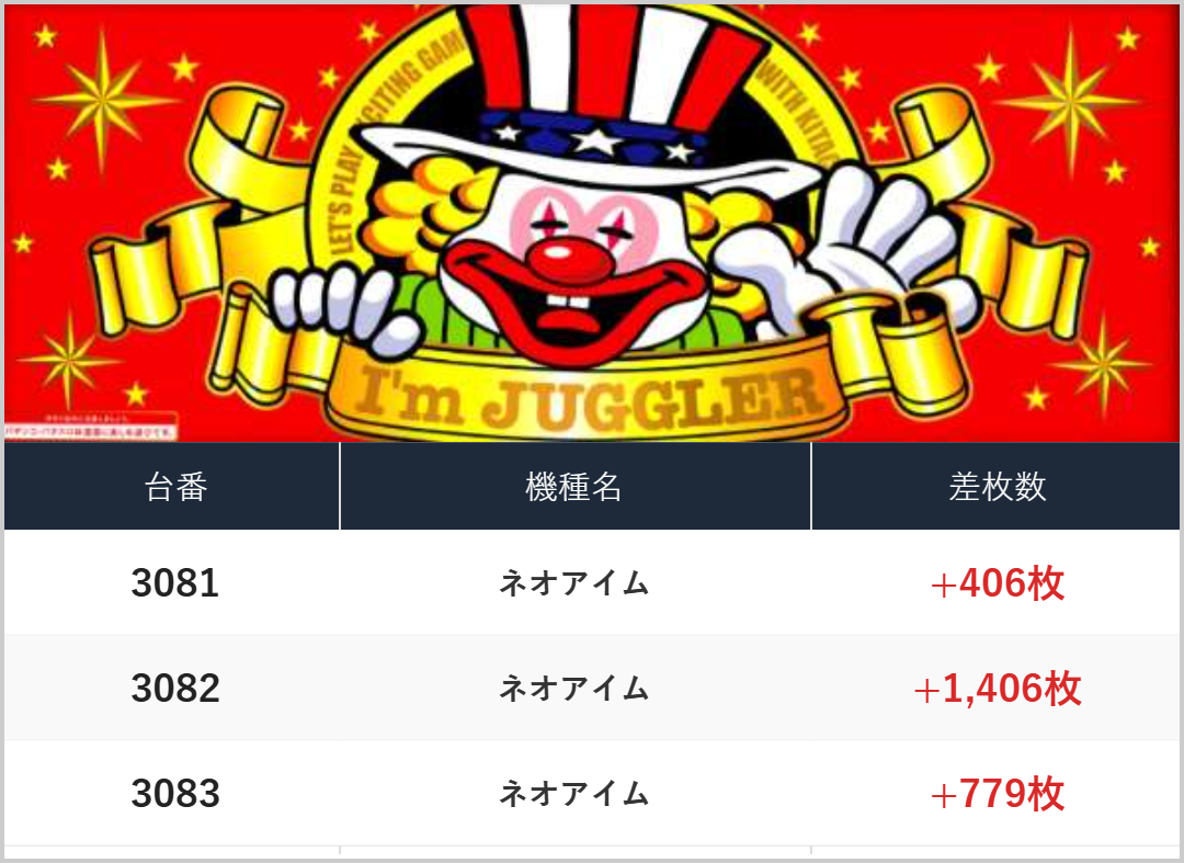 3台並び②:ネオアイム(3081-3083番台)【平均+864枚】