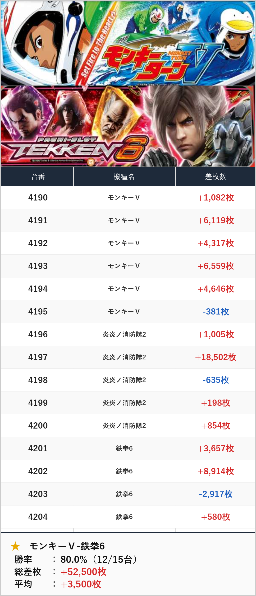 15台並び:モンキーⅤ-鉄拳6(4190-4204番台)【平均+3,500枚】