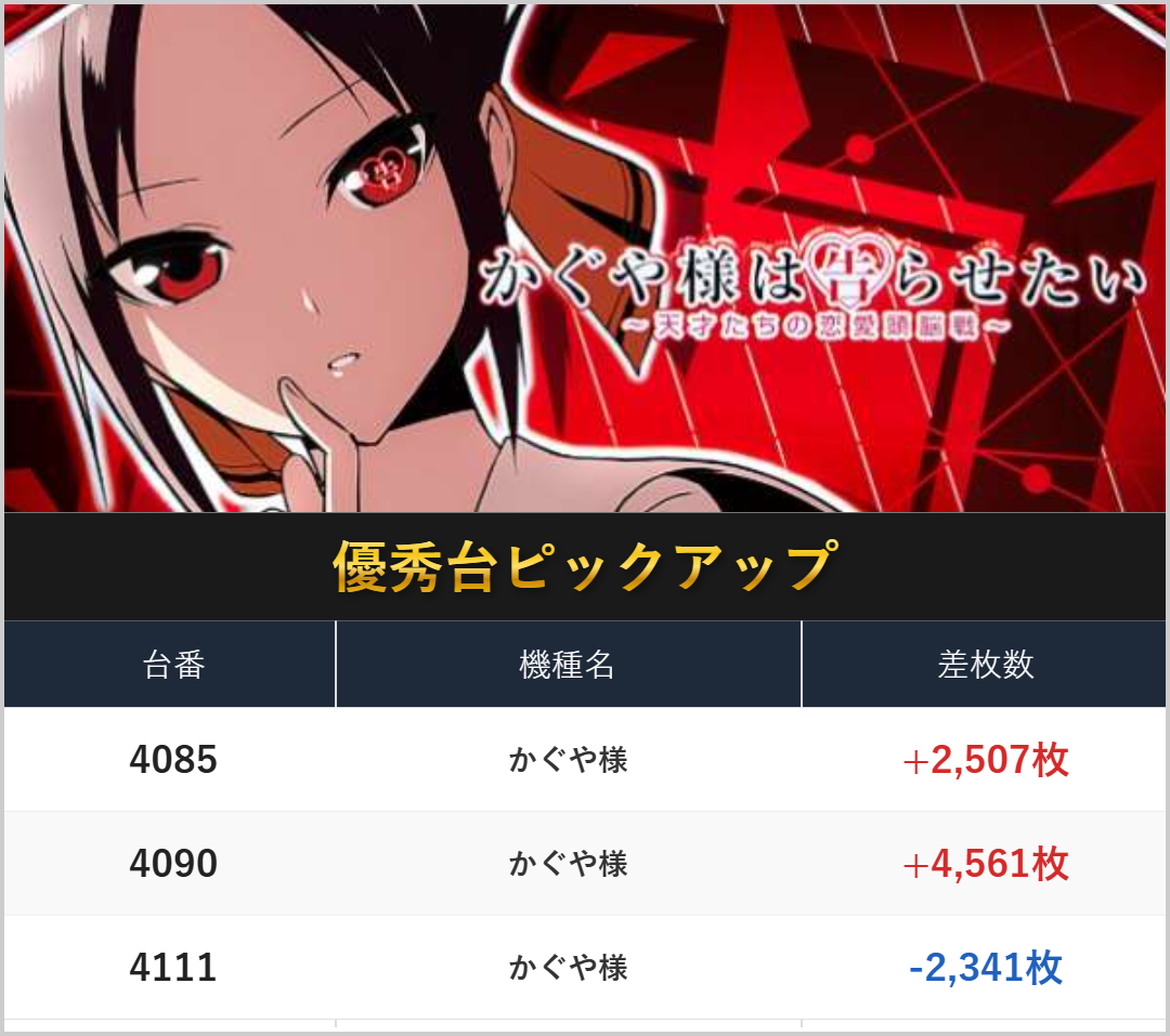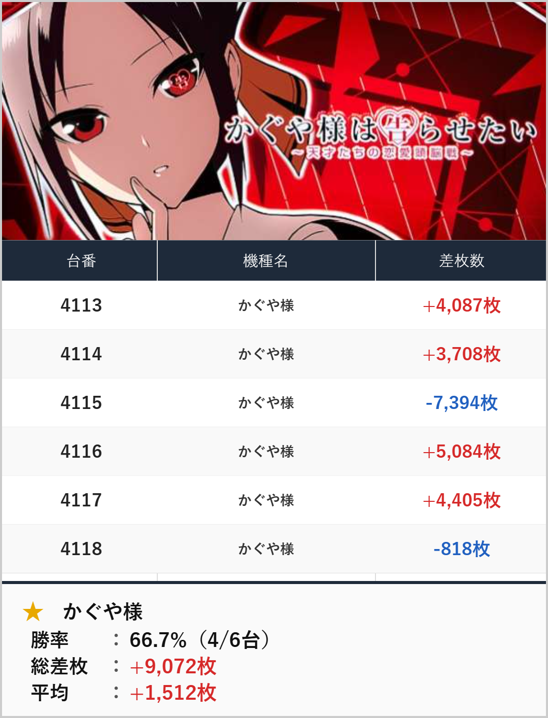 6台並びの常連のかぐや様は、勝率67%・5,000枚over、4,000枚over×3台の好結果に!
