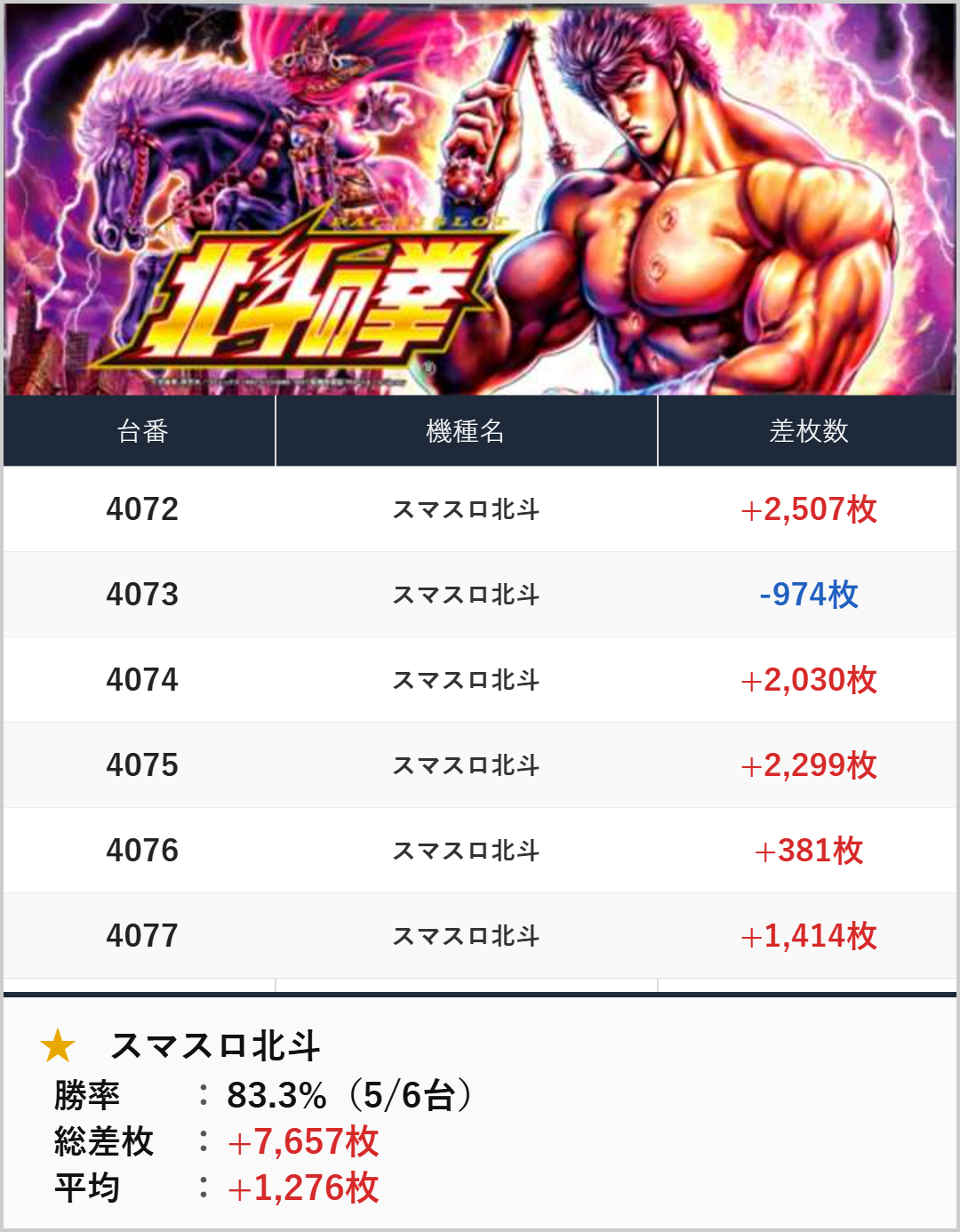 6台並び②:スマスロ北斗(4072-4077番台)【平均+1,276枚】