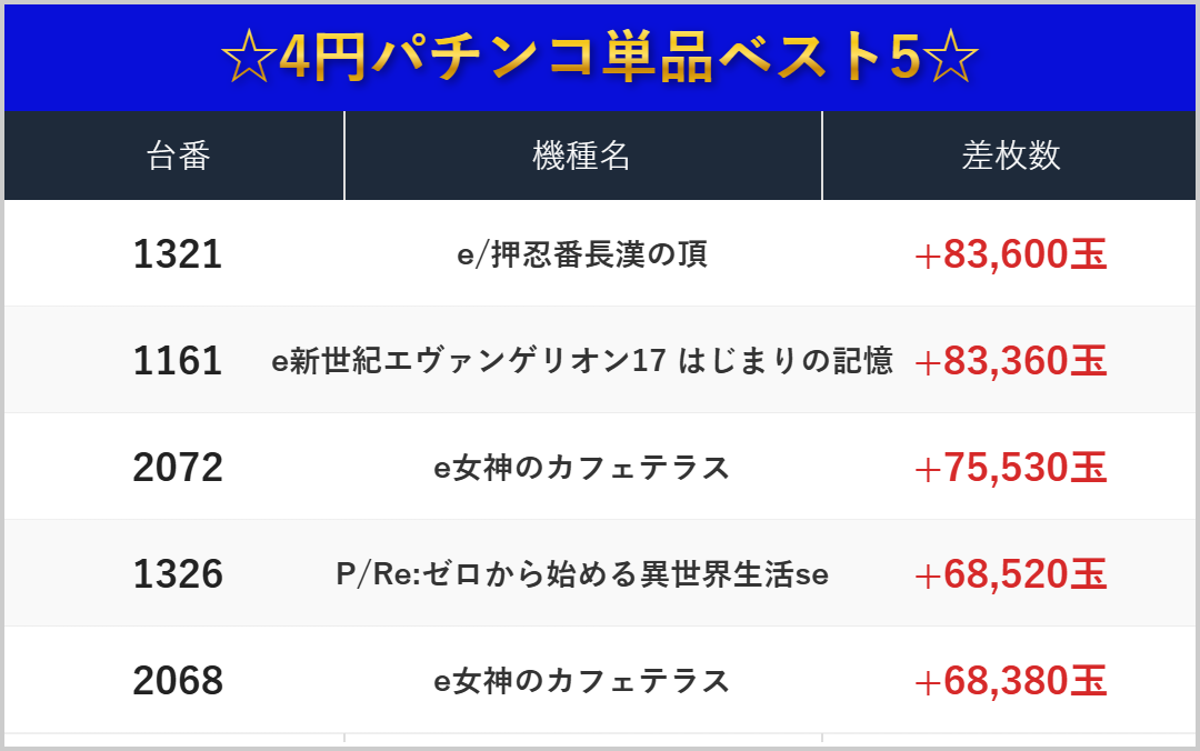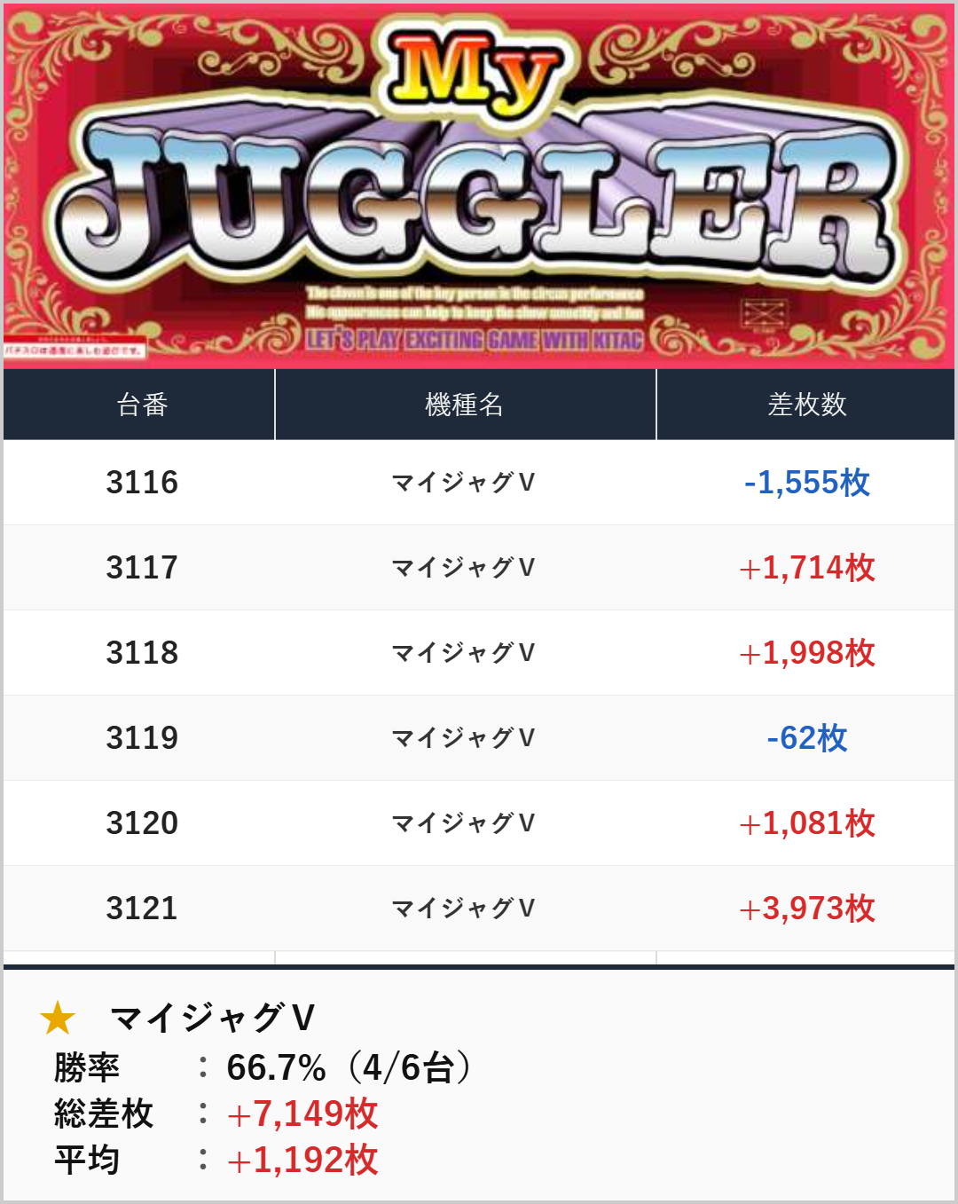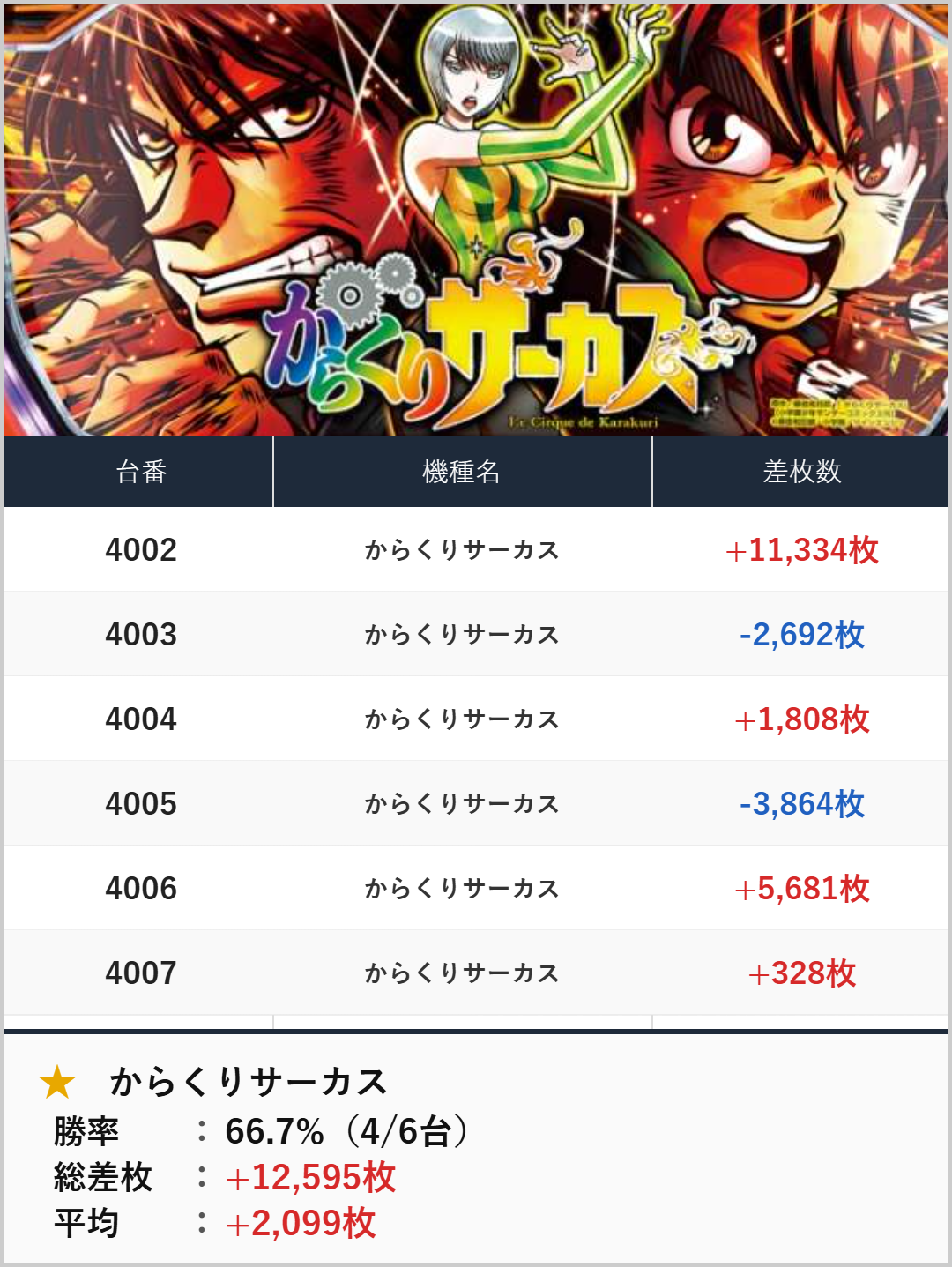 勝率50%・5,000枚over×2台、4,000枚over、3000枚overアリ