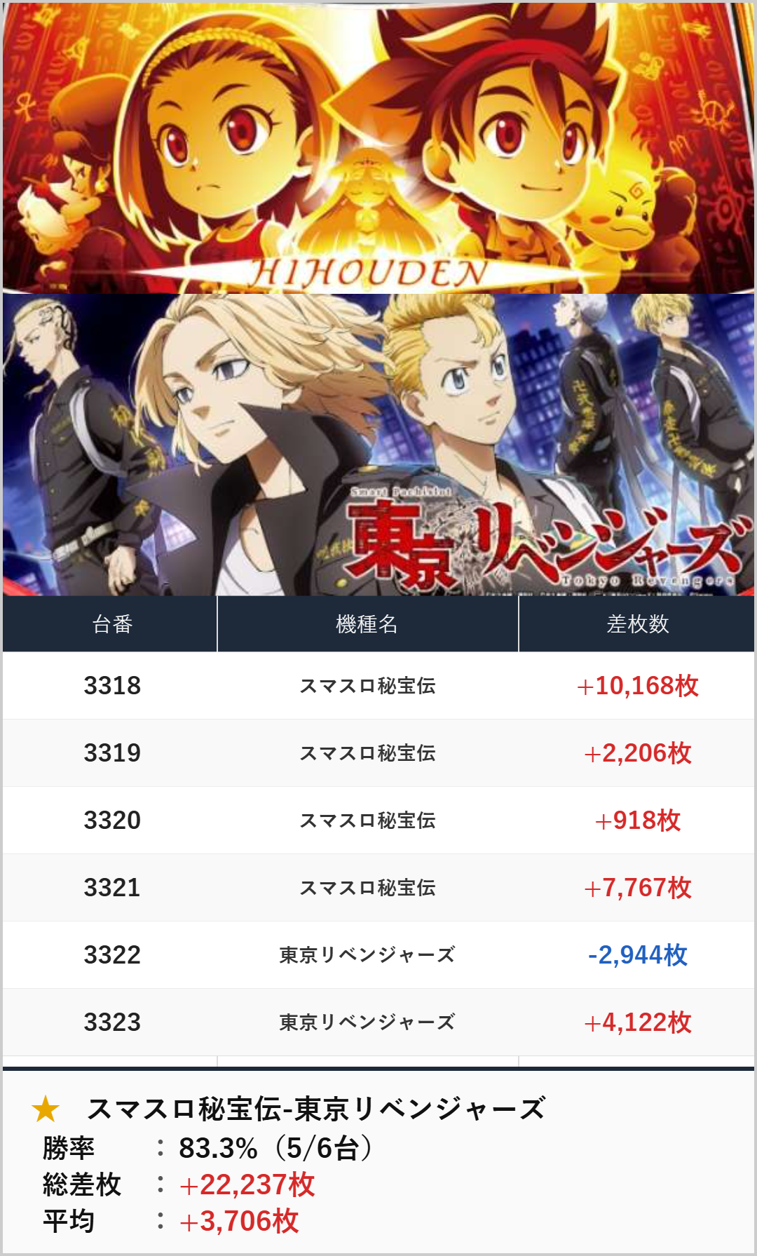 6台並び⑤:スマスロ秘宝伝-東リベ(3318-3323番台)【平均+3,706枚】