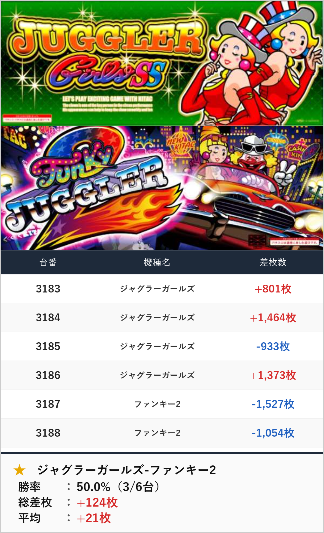 6台並び⑦:ジャグラーガールズ-ファンキー2(3183-3188番台)【平均+21枚】