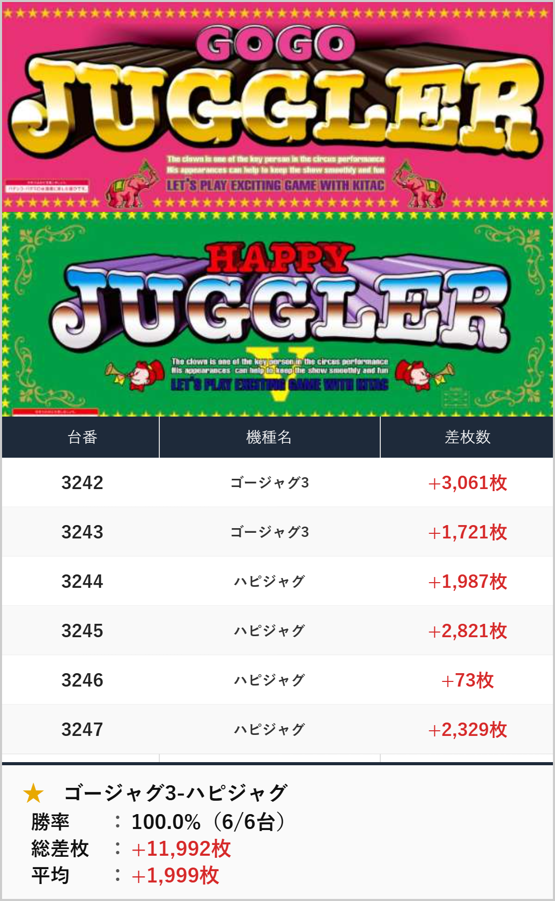 6台並び⑧:ゴージャグ3-ハピジャグ(3242-3247番台)【平均+1,999枚】