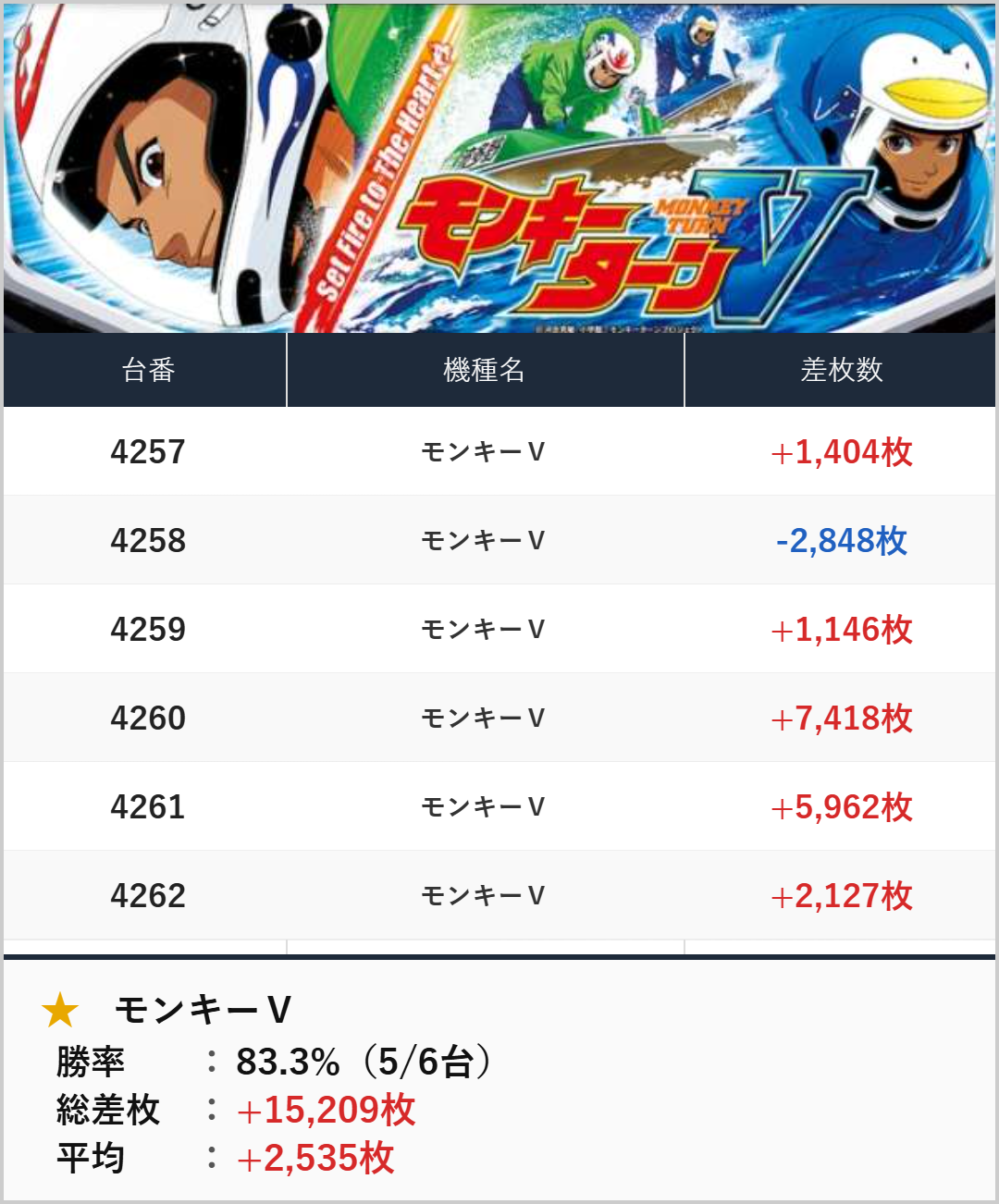 6台並び③:モンキーⅤ(4257-4262番台)【平均+2,535枚】