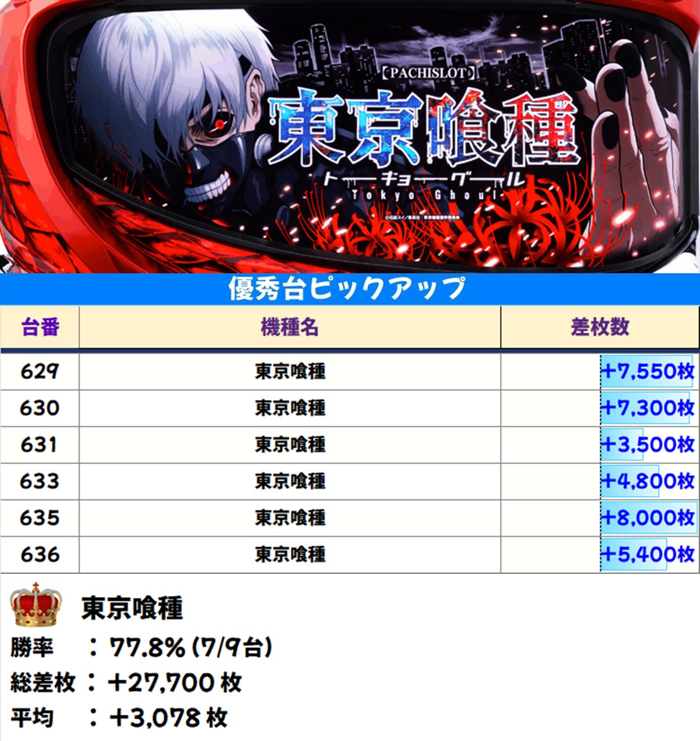 高配分:東京喰種(7/9台+) 【平均+3,078枚】