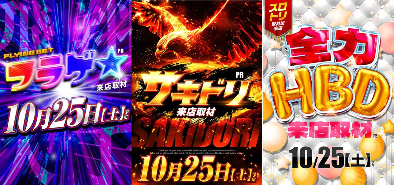 週末はド派手な仕掛けが出現する【ピーアーク松原】。さらに本日はスロがアツい毎月25日! それだけでも期待できるのにフラゲ★来店取材、サキドリ来店取材、全力HBD来店取材の3つの取材も複合! 本日も各エリアから爆発台&優秀台が多数出現すること間違いナシ! 大盛り上がりの1日になりそうですね!