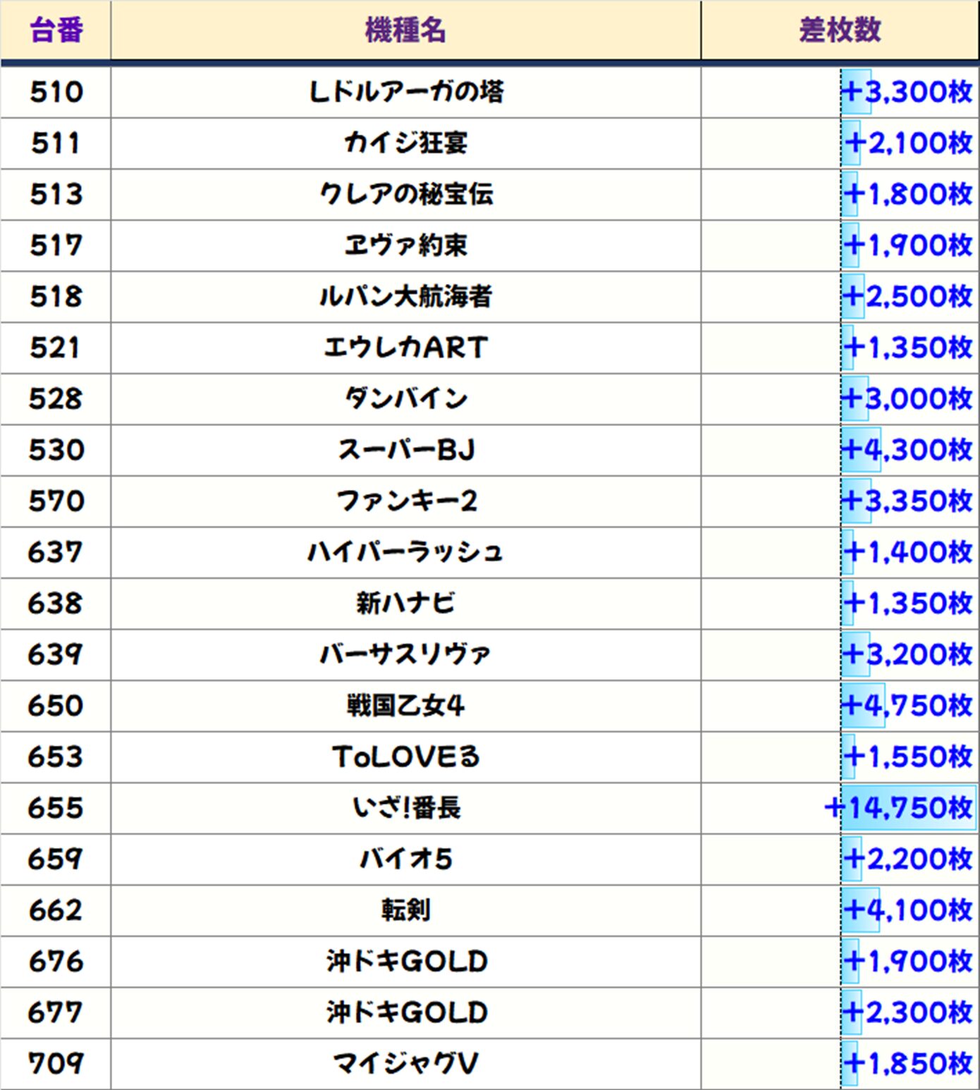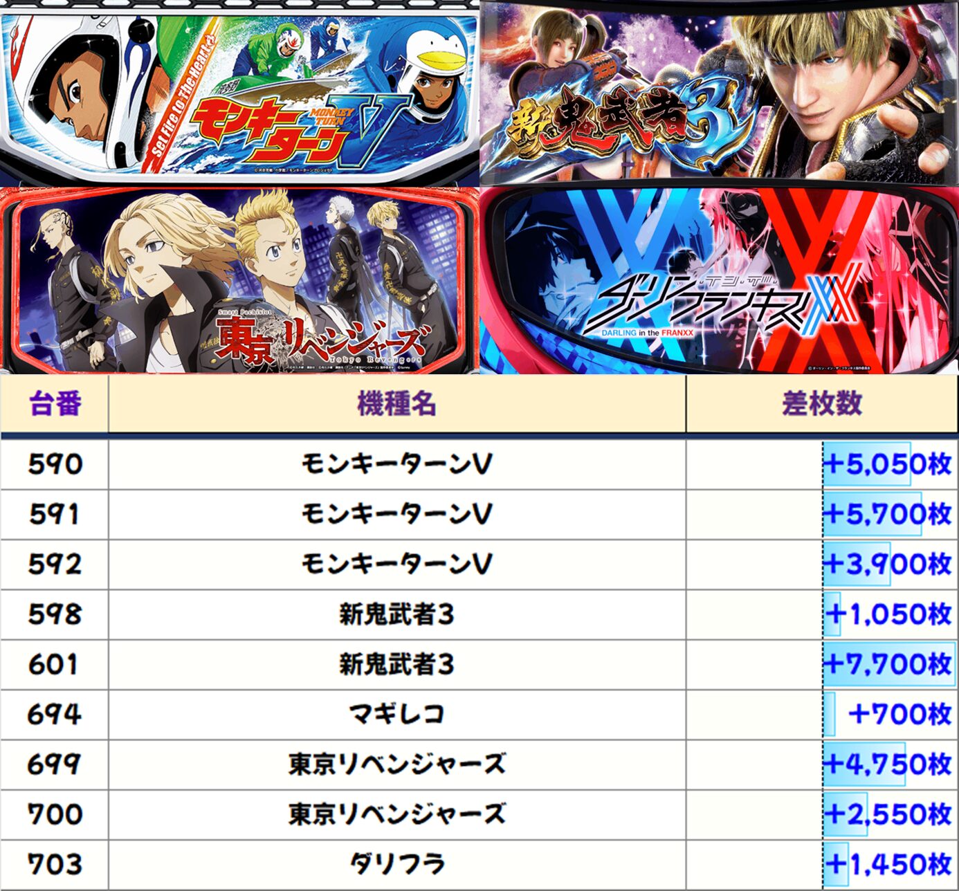 その他の機種にも優秀台が。毎月25日は赤エリアだけでなく青エリアもアツい! 覚えておいて損はないですよ。