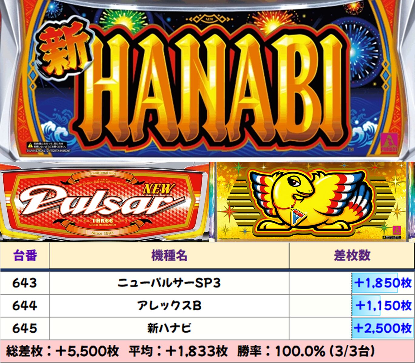 3台並び:ニューパルSP3~新ハナビ【平均+1,833枚】