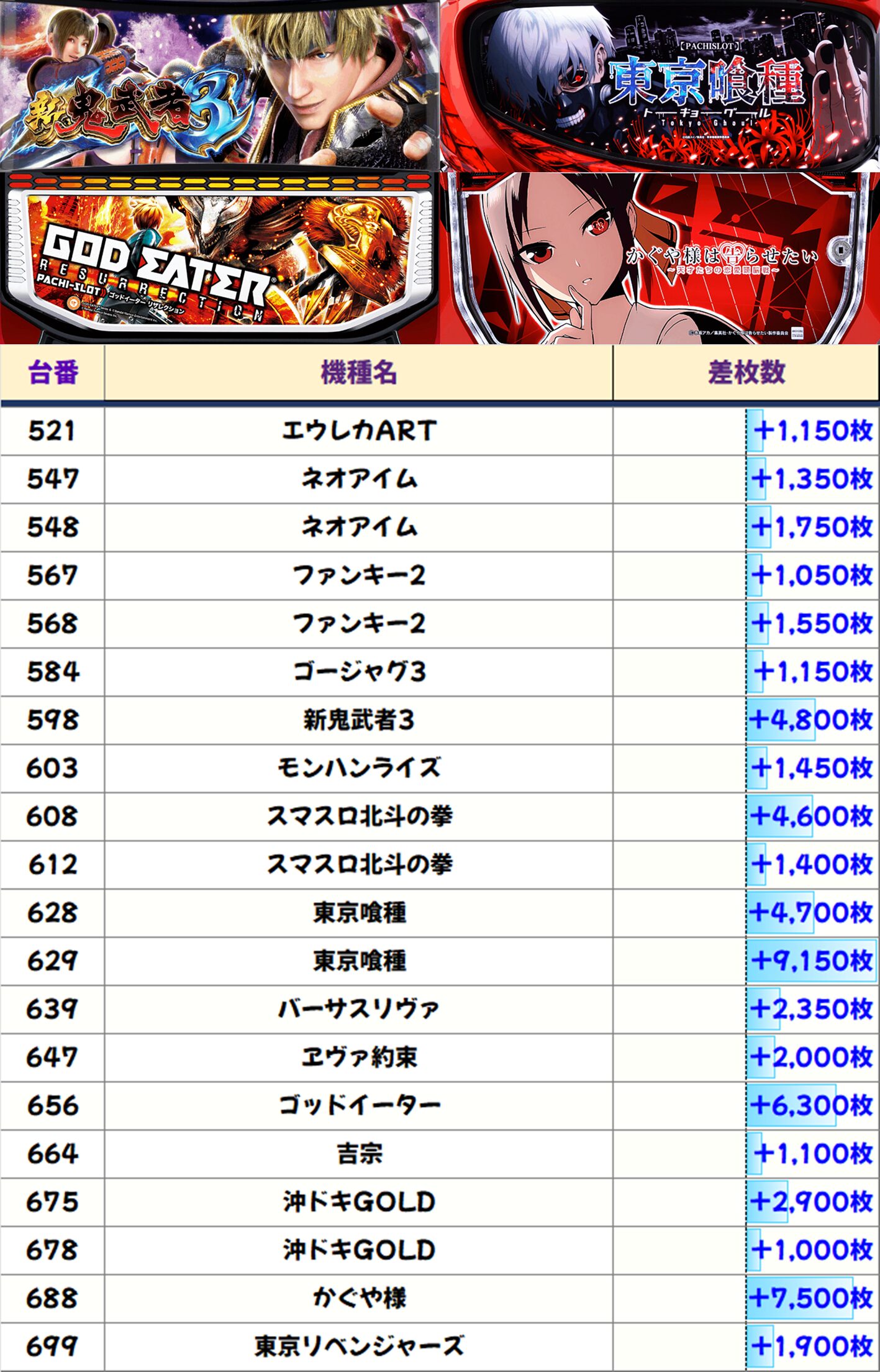 月イチ周年日は単品も盛りだくさん。本日も【東京喰種】から+9,150枚、+4,700枚、【かぐや様】から+7,500枚、【ゴッドイーター】から+6,300枚、【新鬼武者3】から+4,800枚、【スマスロ北斗の拳】から+4,600枚と様々なコーナーから大量出玉獲得台が出現。月イチ周年日はどこを攻めてもチャンスがありますね!