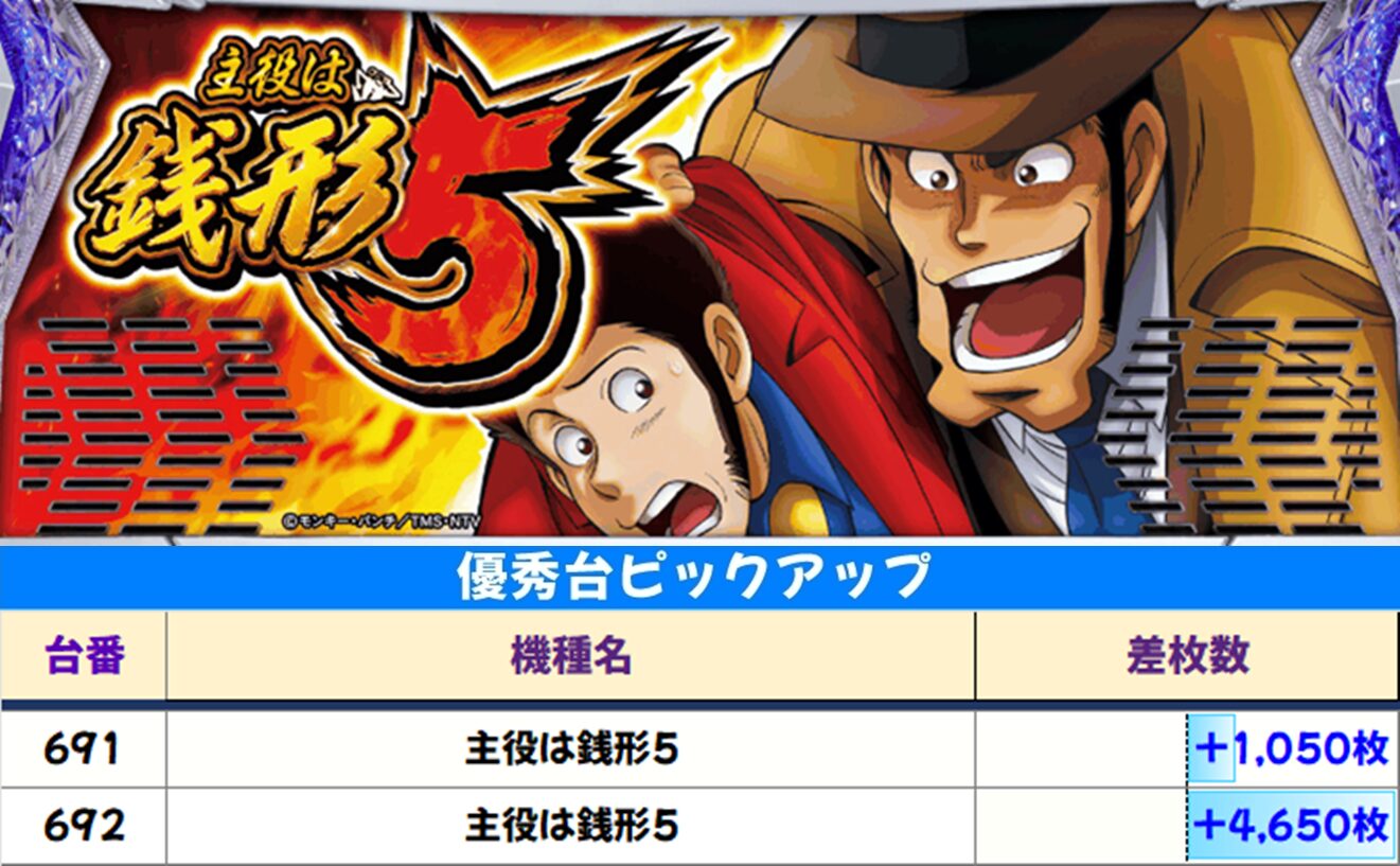 高配分:主役は銭形5(2/3台+)【平均+1,600枚】