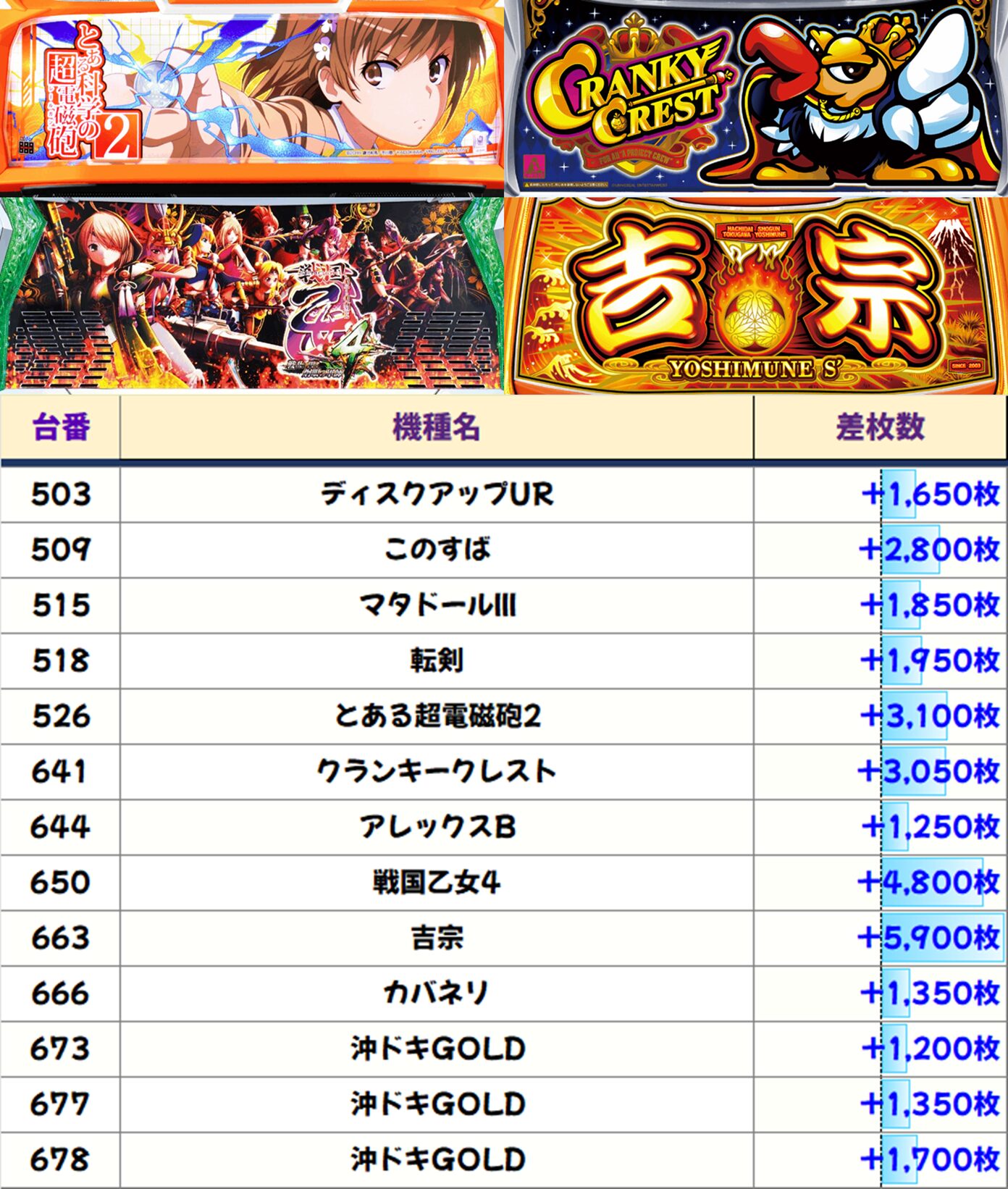 日曜日は単品も山盛り。本日も【吉宗】から+5,900枚、【戦国乙女4】から+4,800枚、【とある超電磁砲2】から+3,100枚、【クランキークレスト】から+3,050枚と赤、青エリア以外からも大量出玉獲得台が出現。全体では48台が差枚数+1,000枚以上の好成績を収めました。