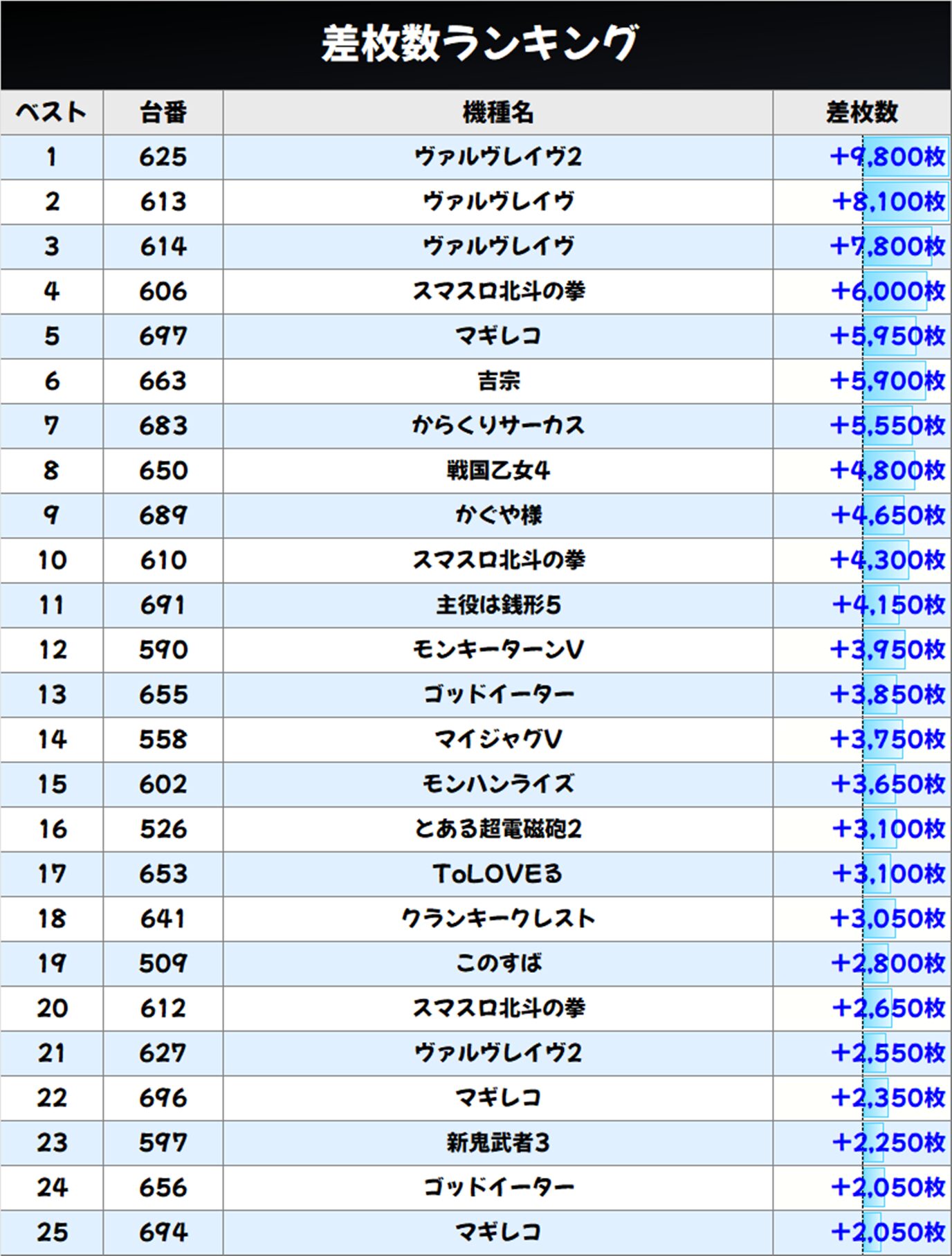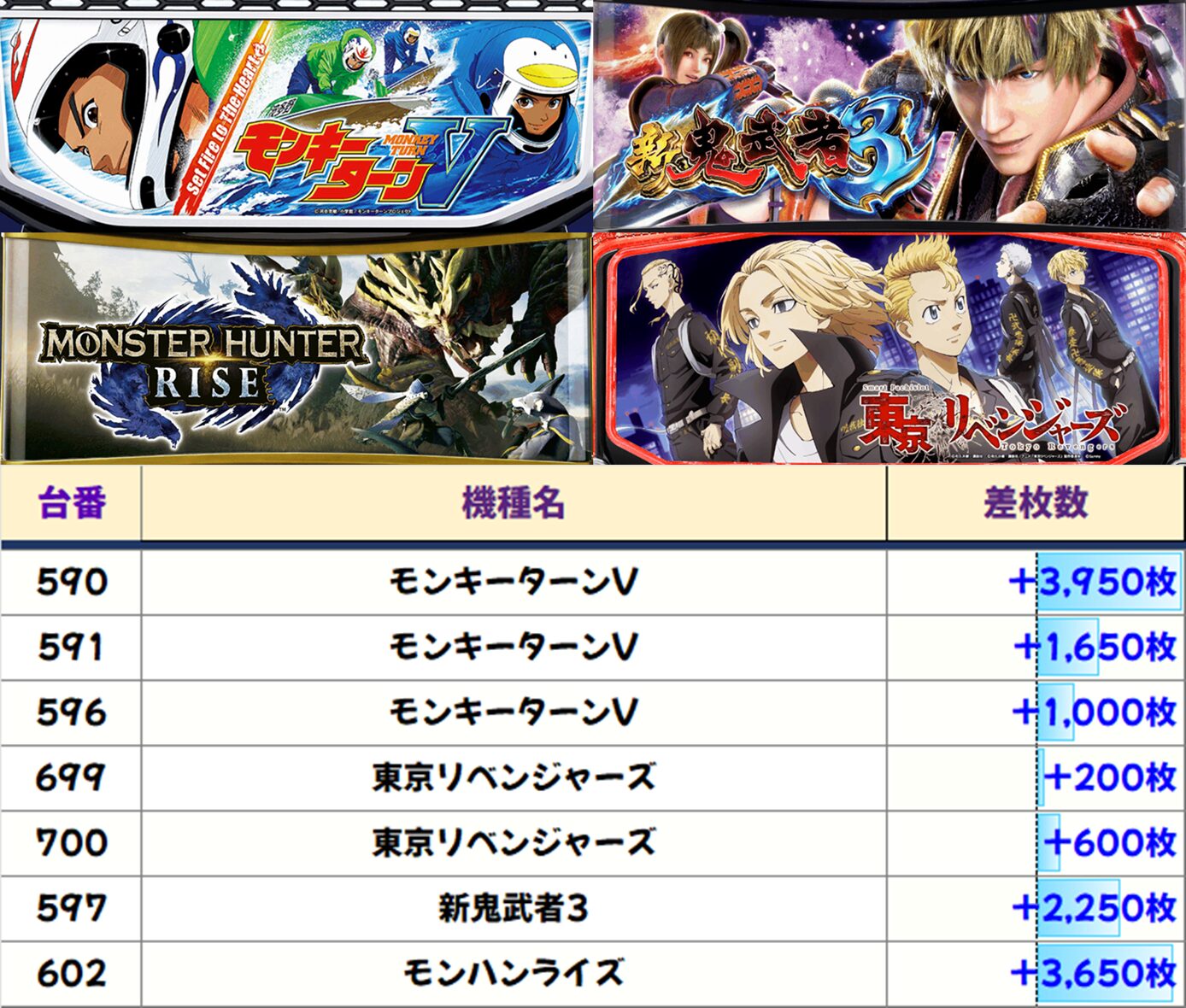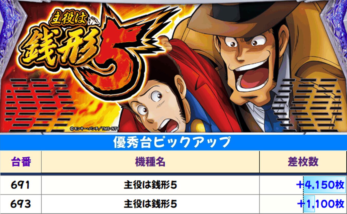 【ヴァルヴレイヴ】の結果は総差枚+12,950枚、平均差枚+4,317枚で3台中2台がプラス差枚。プラスの台は+8,100枚、+7,800枚と2台とも大爆発! 高品質なお宝台だったのは間違いないでしょう。【主役は銭形5】も2台がプラス。+4,150枚の爆発台も出現しました。