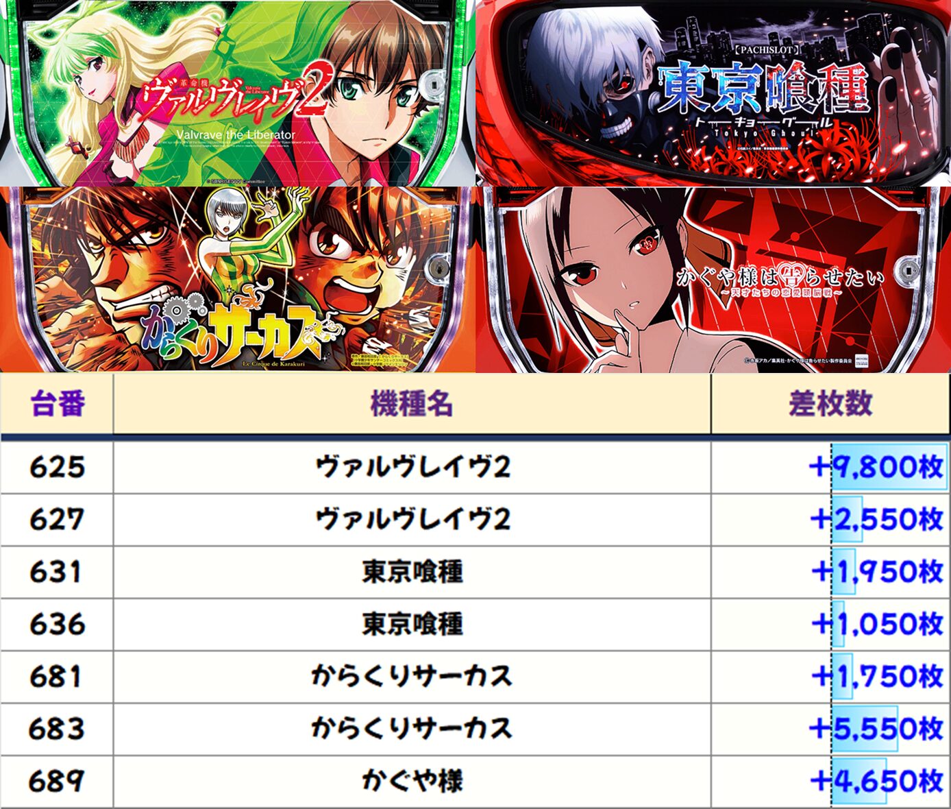 その他の機種にもしっかりお宝台が! 【ヴァルヴレイヴ2】から+9,800枚、【からくりサーカス】から+5,550枚、【かぐや様】から+4,650枚と大量出玉獲得台が複数出現! 日曜日の赤エリアは別格ですね!