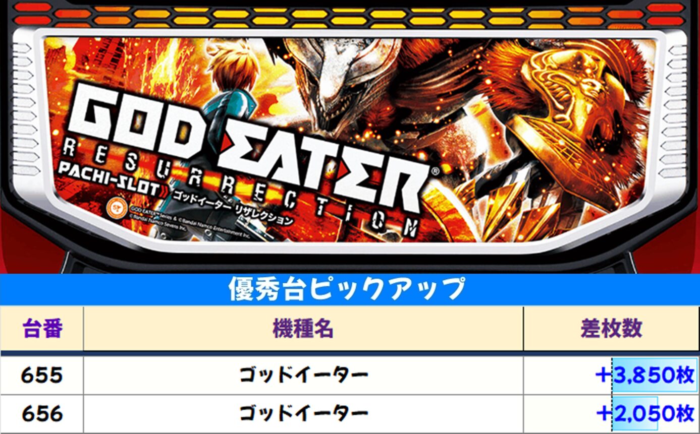 高配分機種は【ゴッドイーター】と【ToLOVEるダークネス】。どちらも3台設置機種なので、日曜日は全台系にも期待できる少台数機種も狙い目ですよ。