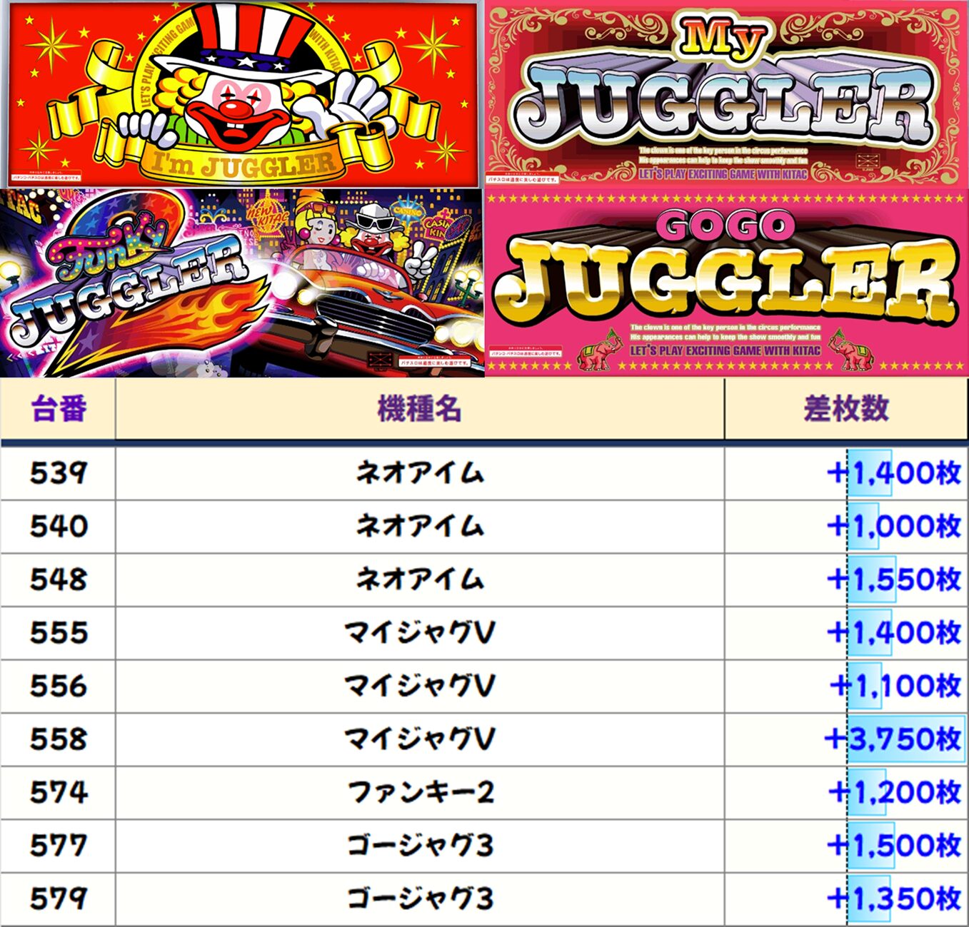 日曜日はジャグラーシリーズの扱いも〇。お宝台が多数あるので手堅くジャグラーで勝負するのもオススメです。