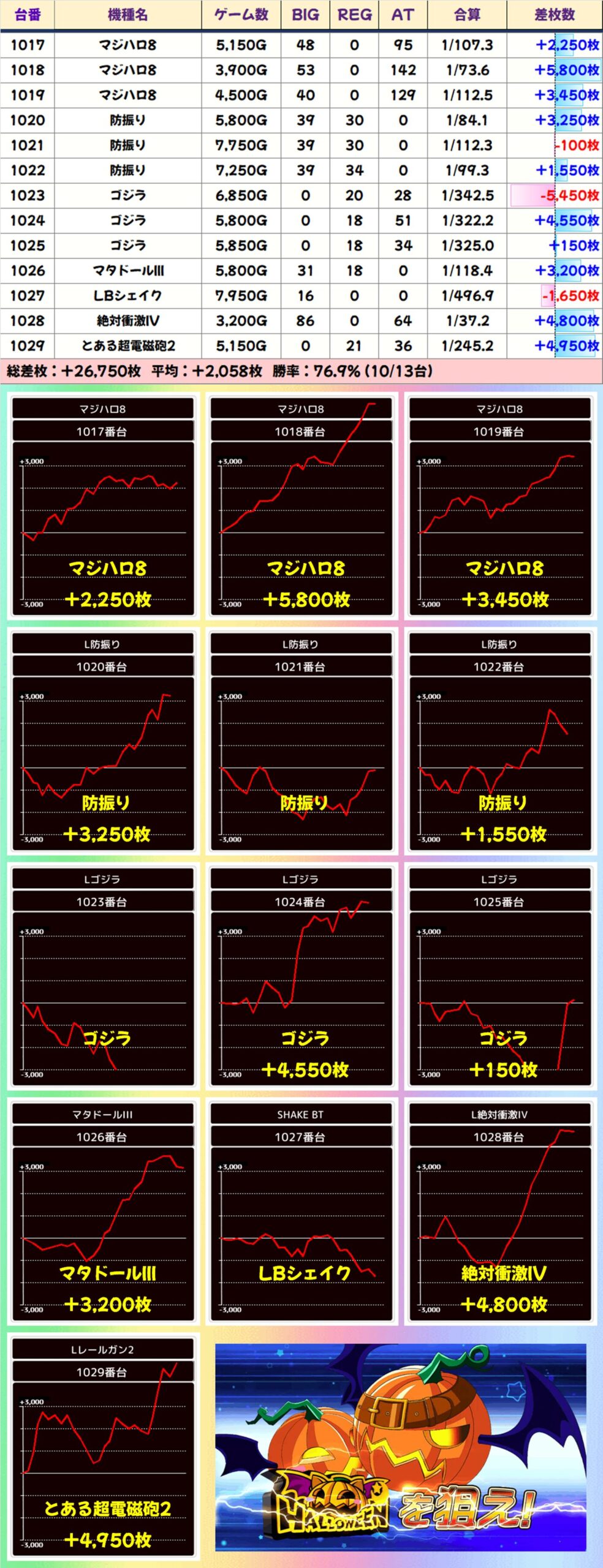 13台並びの結果は総差枚+26,750枚、平均差枚+2,058枚で10台がプラス差枚。【マジハロ8】の+5,800枚を筆頭に9台が1,500枚以上の出玉を獲得しました。