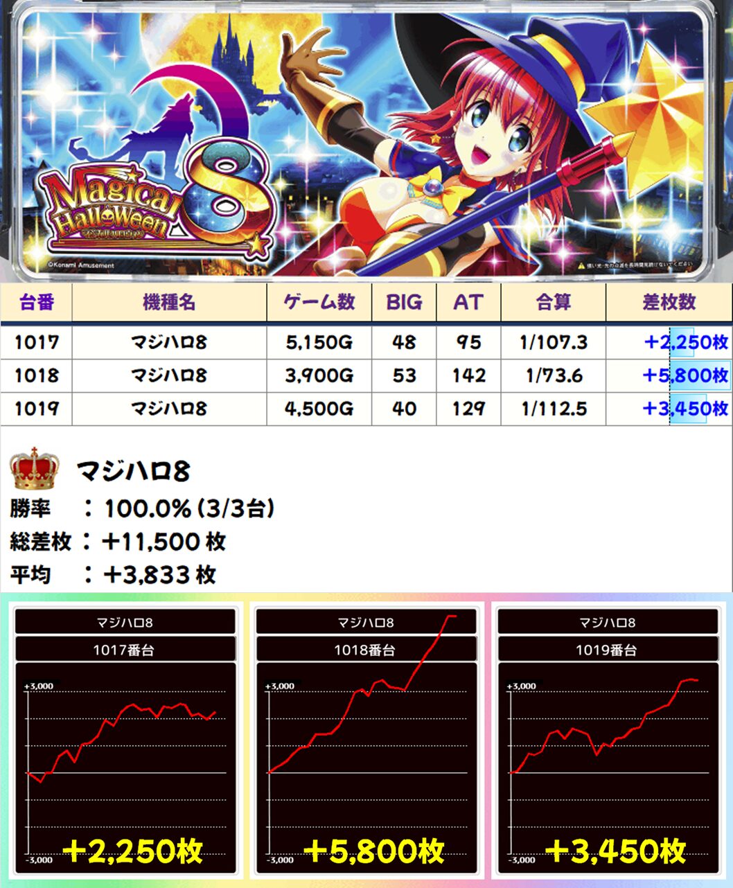 【マジハロ8】が全台系濃厚。【マジハロ8】の結果は総差枚+11,500枚、平均差枚+3,833枚で全台プラス差枚。+5,800枚、+3,450枚、+2,250枚と3台ともまとまった出玉を獲得して大勝利!