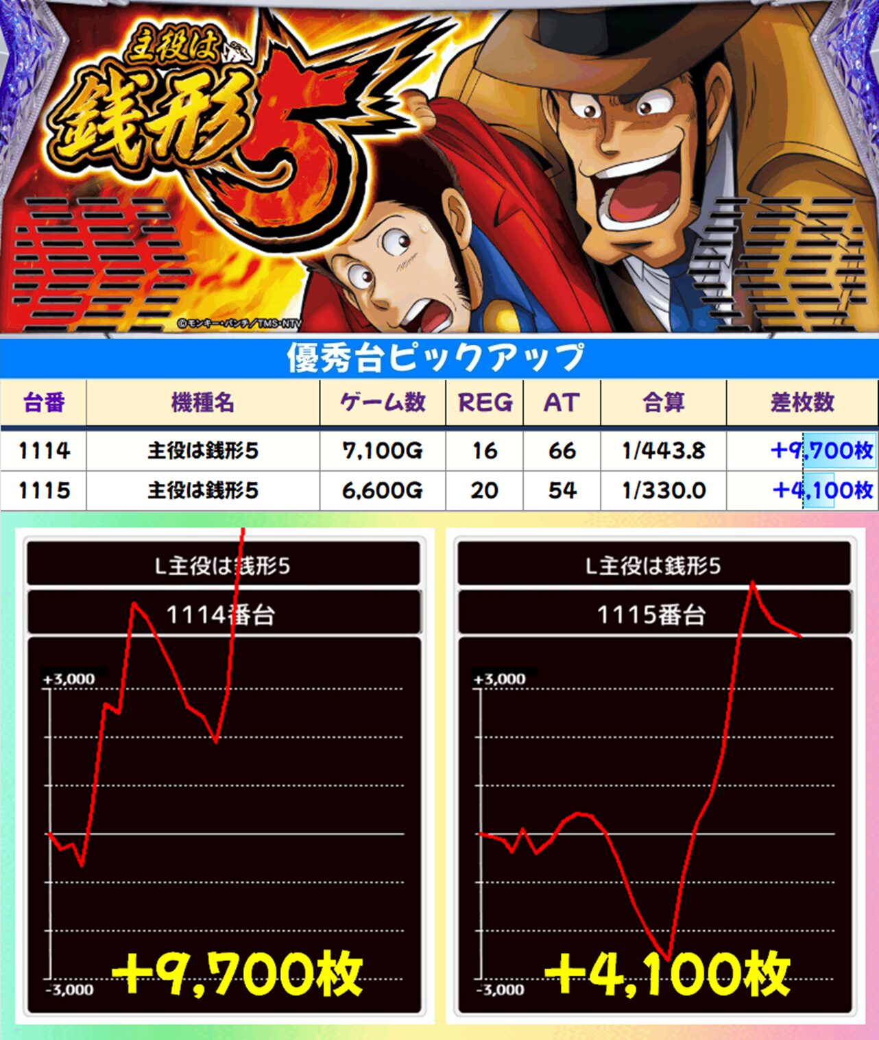 高配分:主役は銭形5(2/4台+)【平均+1,275枚】