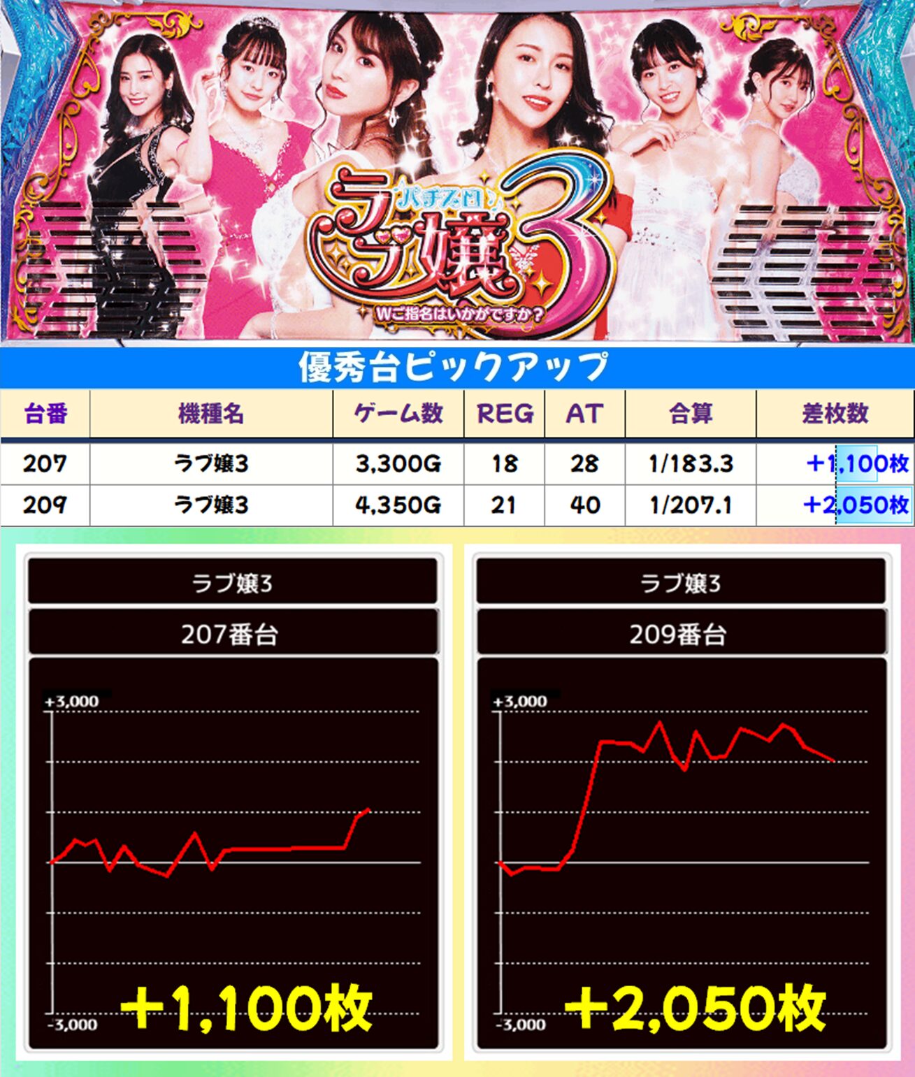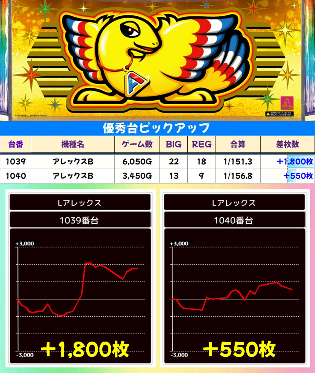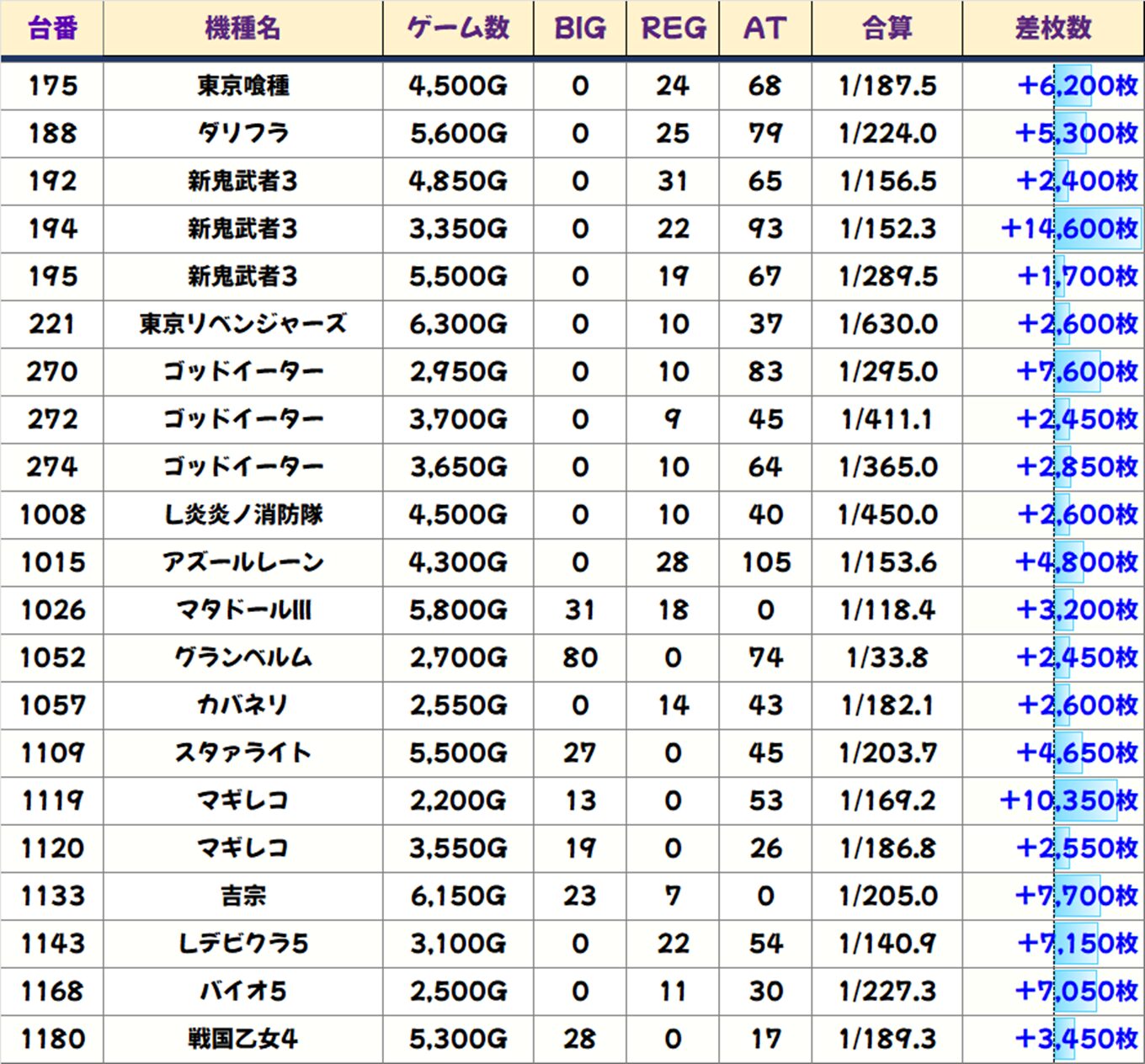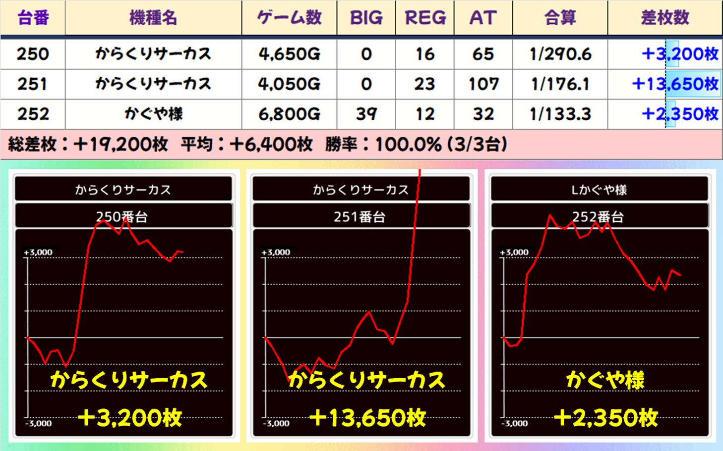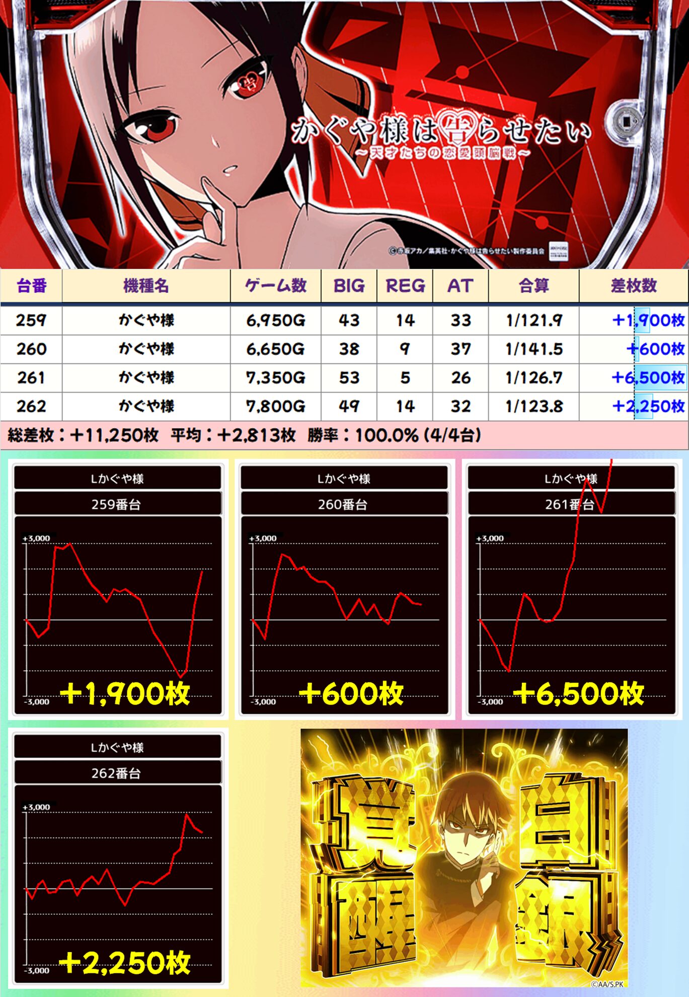【かぐや様】の結果は総差枚+14,150枚、平均差枚+1,286枚で11台中7台がプラス差枚。4台並びの仕掛けも複合していました。+6,500枚、+5,800枚、+3,600枚と爆発台も複数出現したので高品質なお宝台だったことが伺えますね。