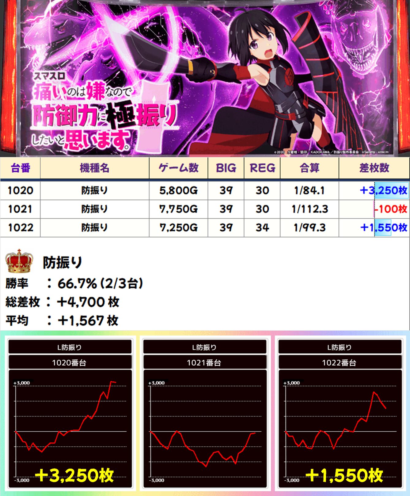【防振り】も全台系濃厚。結果は総差枚+4,700枚、平均差枚+1,567枚で3台中2台がプラス差枚。全台しっかり回されているので打ち手には高設定であることが伝わっていたでしょうね。