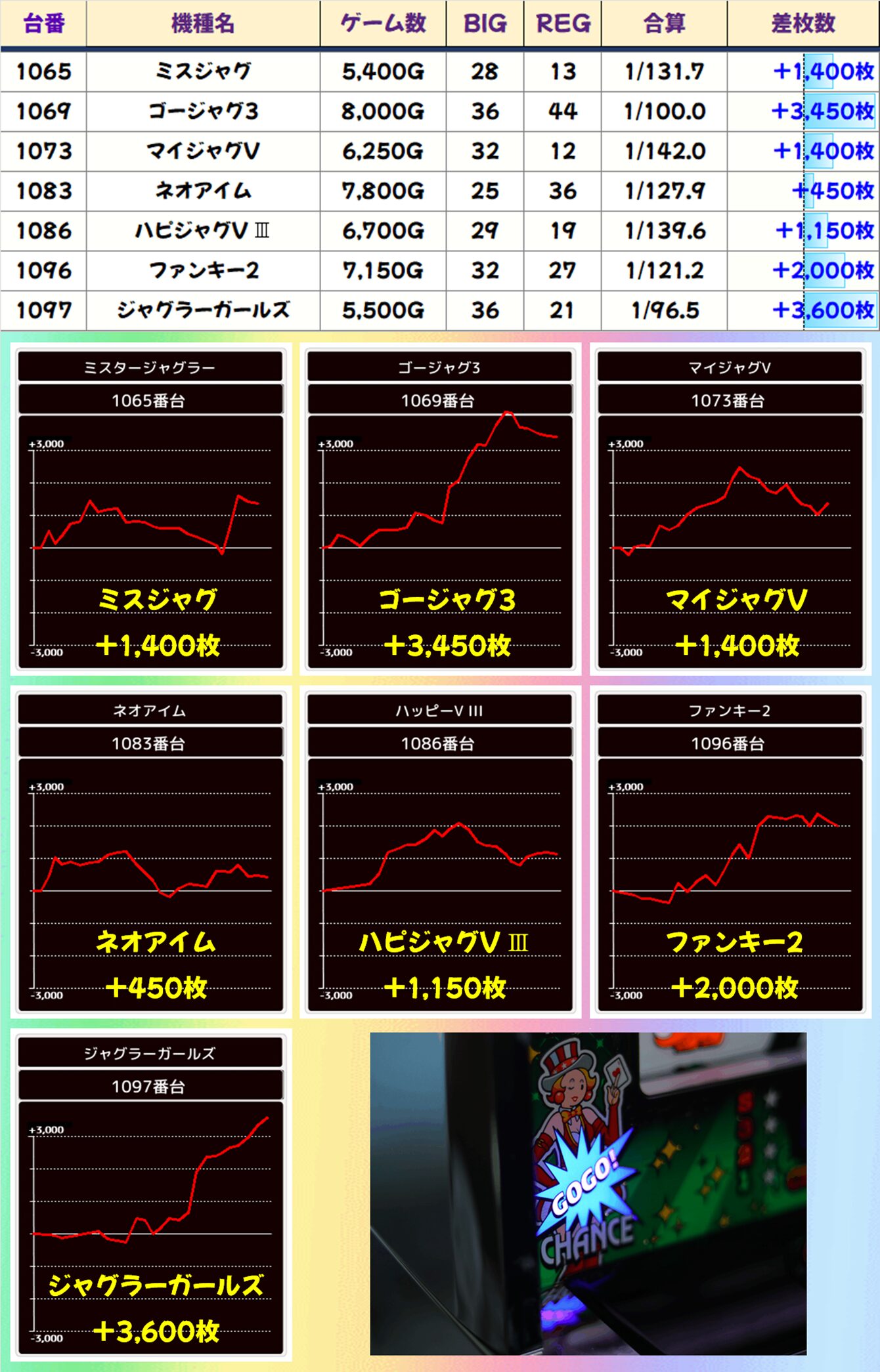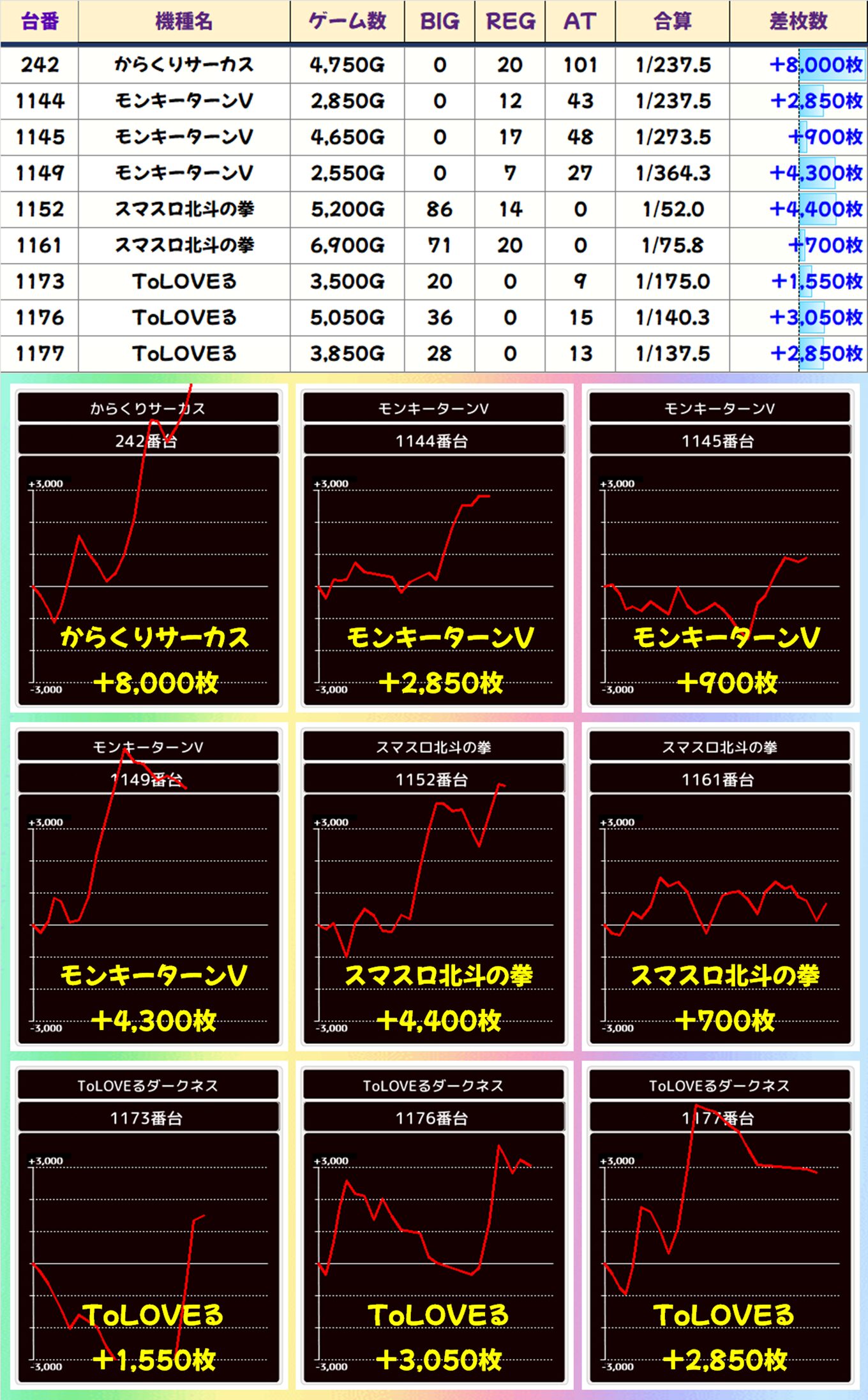 本日の結果は総差枚+99,100枚、平均差枚+337枚の超好成績! 至るところから優秀台が出現し、お祭り騒ぎの1日になりました!