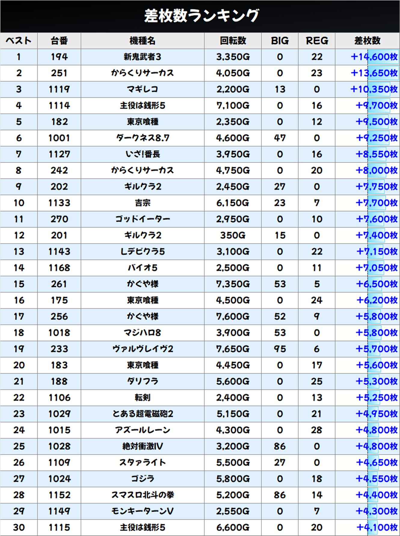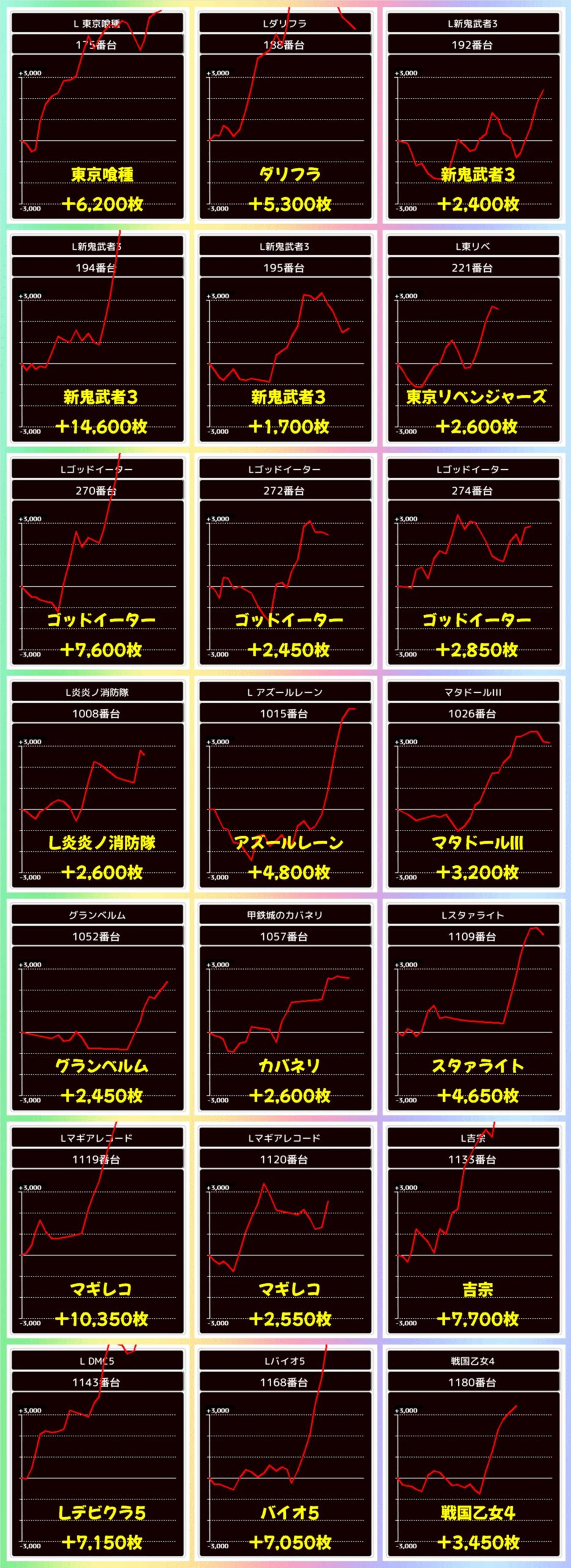 単品も盛りだくさん! 【新鬼武者3】から+14,600枚、【マギレコ】から+10,350枚、【吉宗】から+7,700枚、【ゴッドイーター】から+7,600枚、【Lデビクラ5】から+7,150枚、【バイオ5】から+7,050枚、【東京喰種】から+6,200枚、【ダリフラ】から+5,300枚と+5,000枚オーバーの大爆発台も多数出現。仕掛け&単品で大いに盛り上がった8のつく日でした!