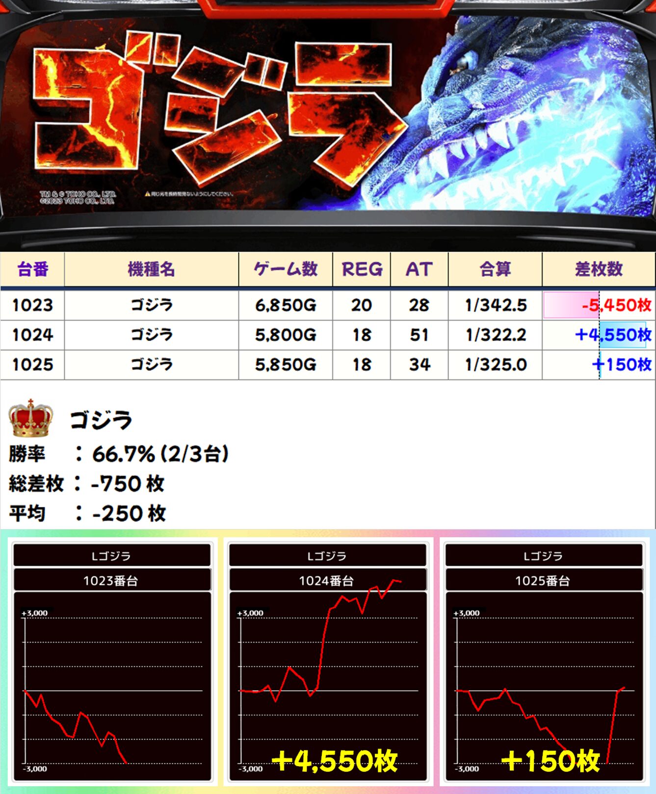 【ゴジラ】も全台系濃厚。1024番台から4,500枚オーバーの大量出玉が炸裂しましたが、残りの2台は残念ながら不発…。フル稼働していたので高設定示唆演出などが出ていたと思いますが、今回は高設定とヒキが噛み合わなかったみたいですね。