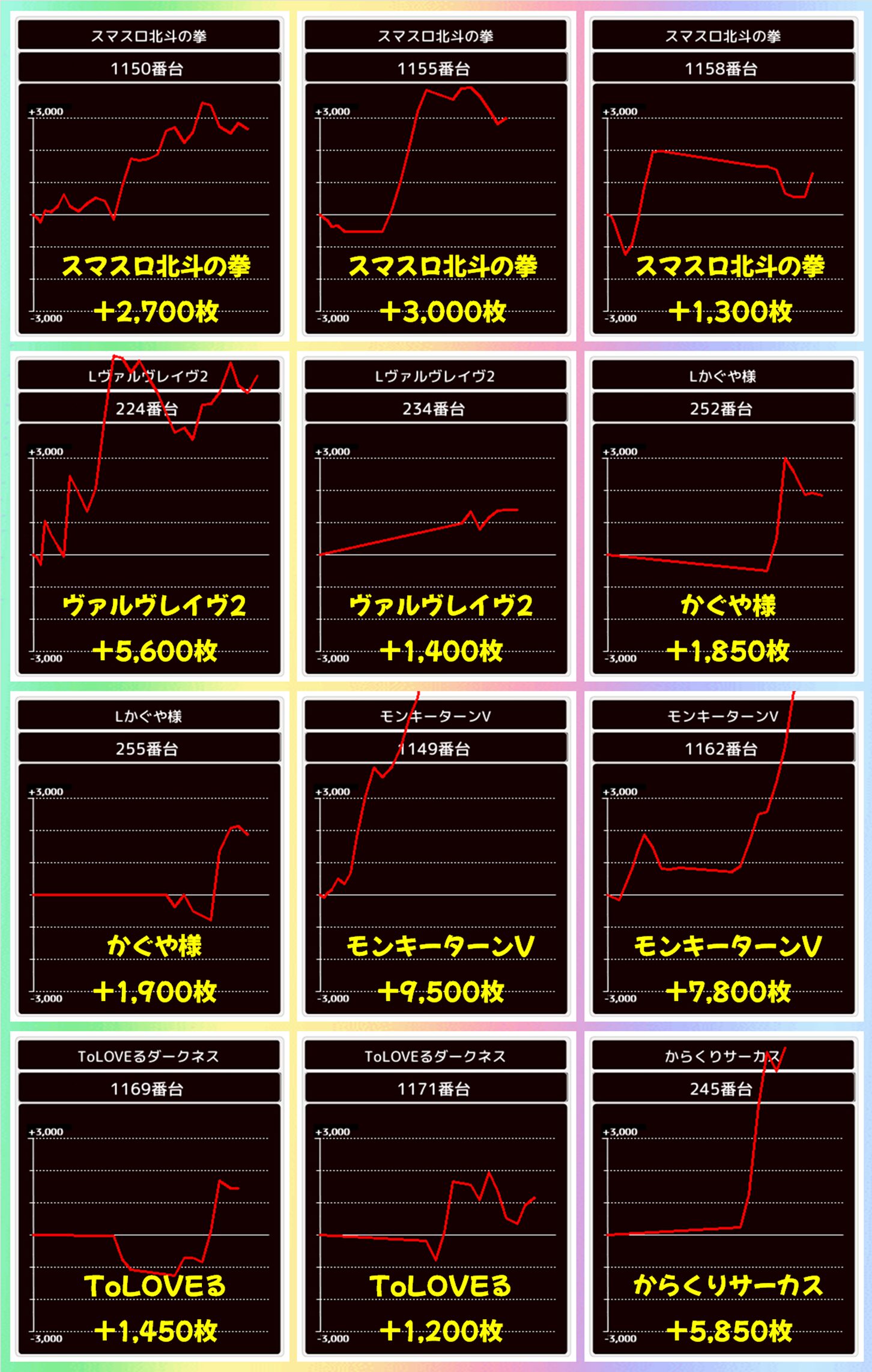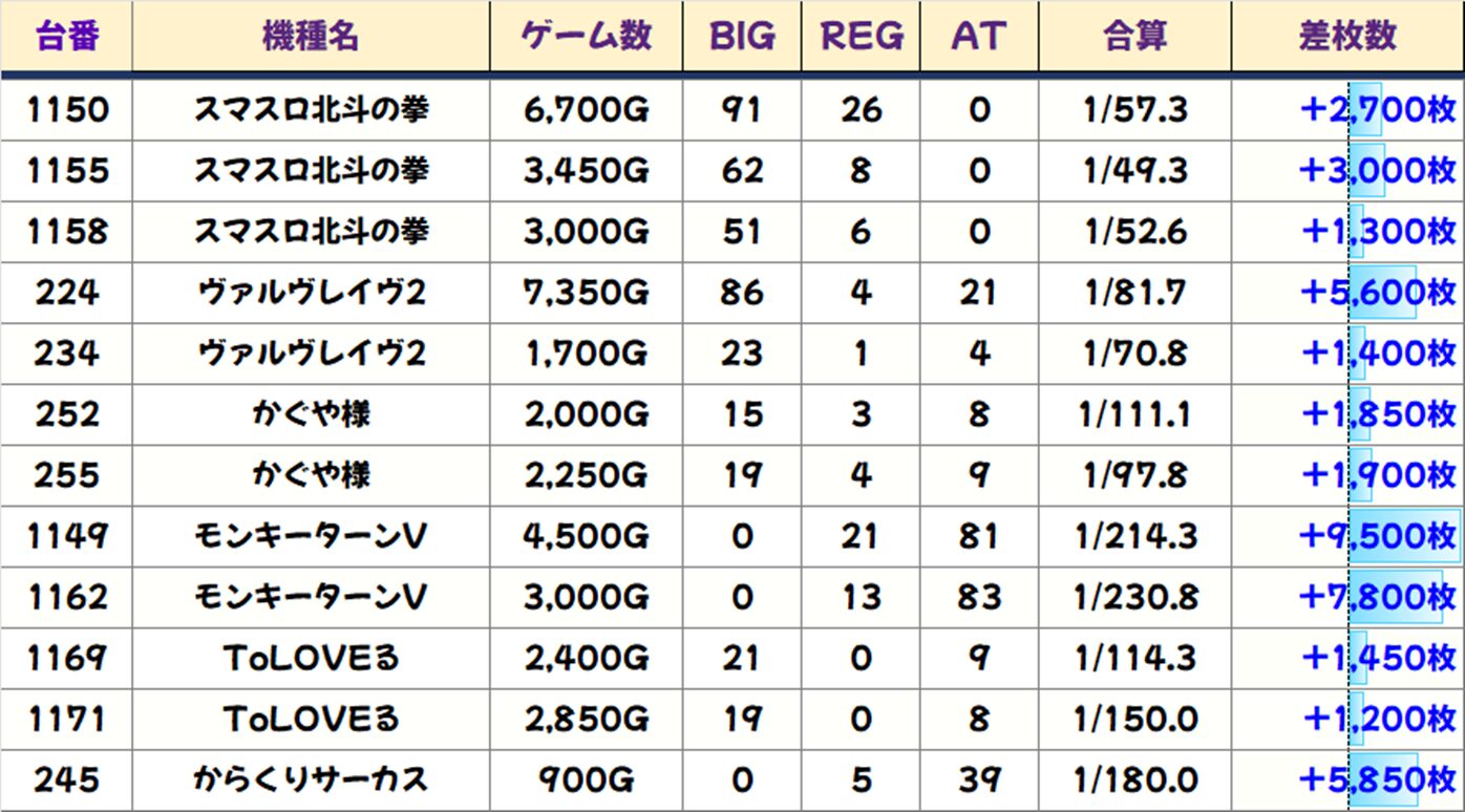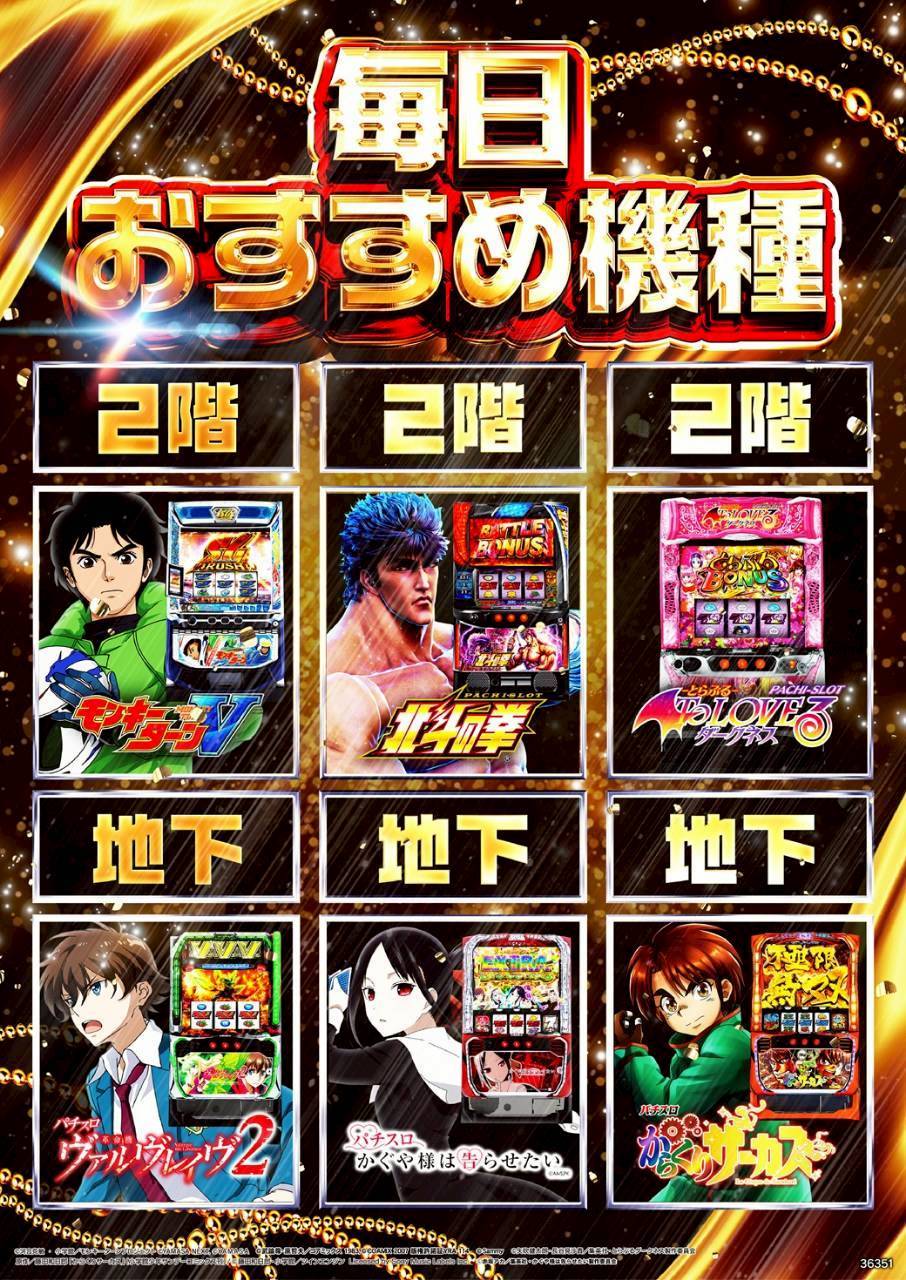 毎日オススメ機種は【モンキーターンV】【スマスロ北斗の拳】【ToLOVEるダークネス】【ヴァルヴレイヴ2】【かぐや様】【からくりサーカス】の6機種。本日は【モンキーターンV】から+9,500枚、+7,800枚、【からくりサーカス】から+5,850枚、【ヴァルヴレイヴ2】から+5,600枚と大爆発台が複数出現。毎日オススメ機種も8のつく日仕様になっているので、大勝ちを狙うならこの6機種がオススメです。
