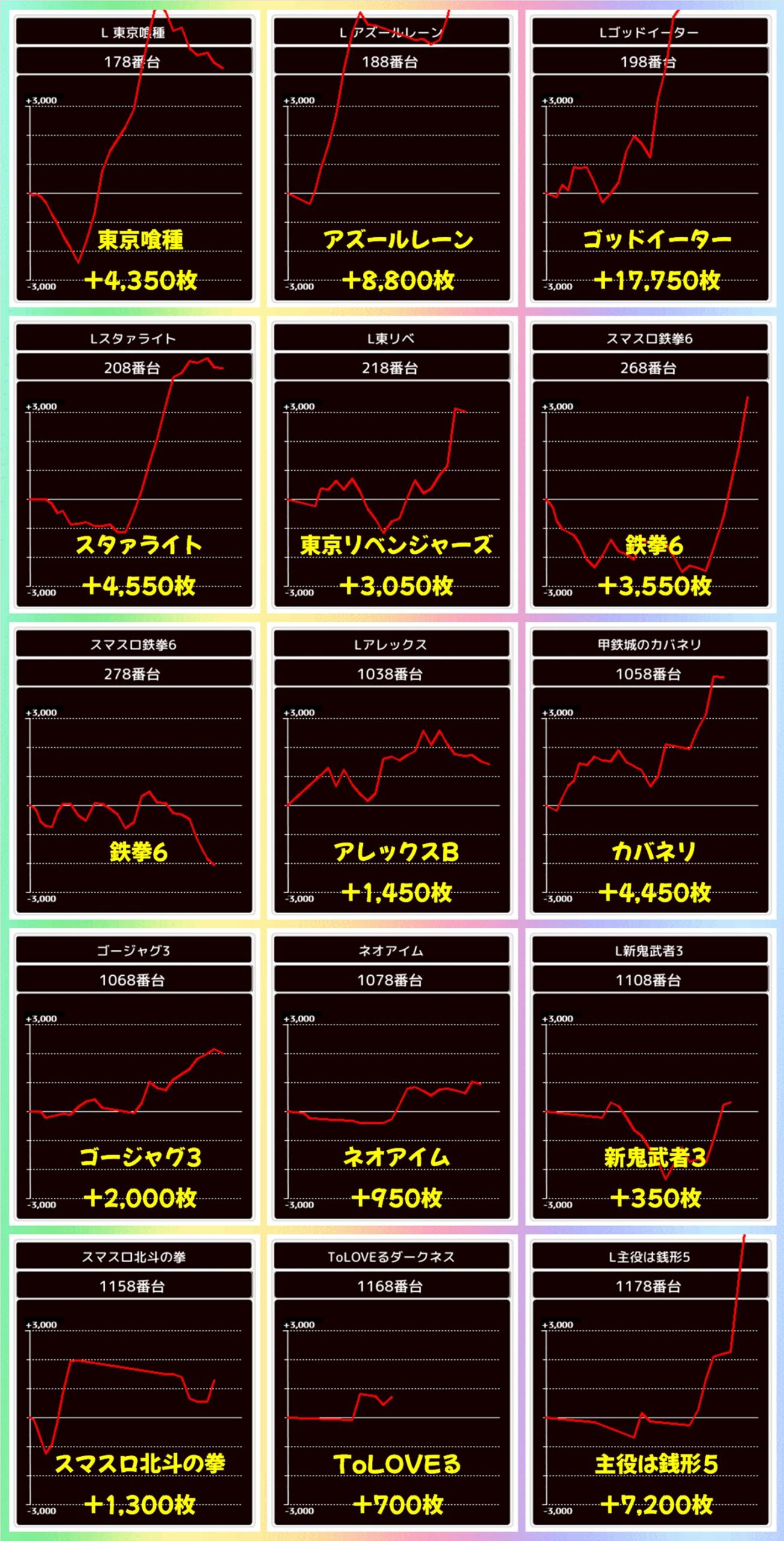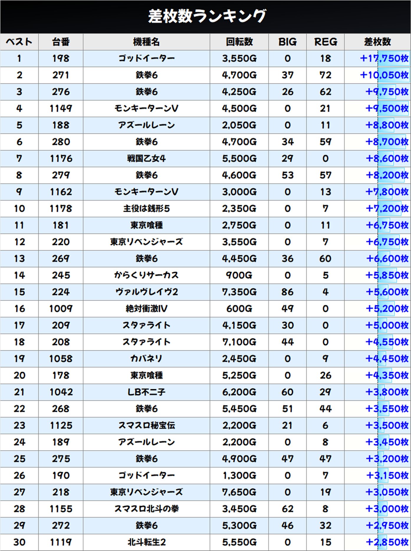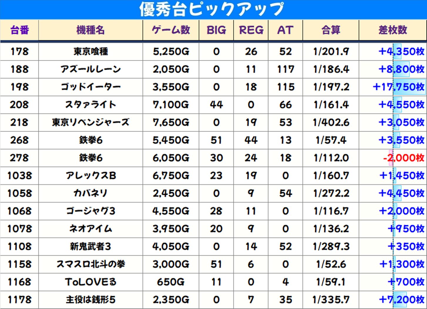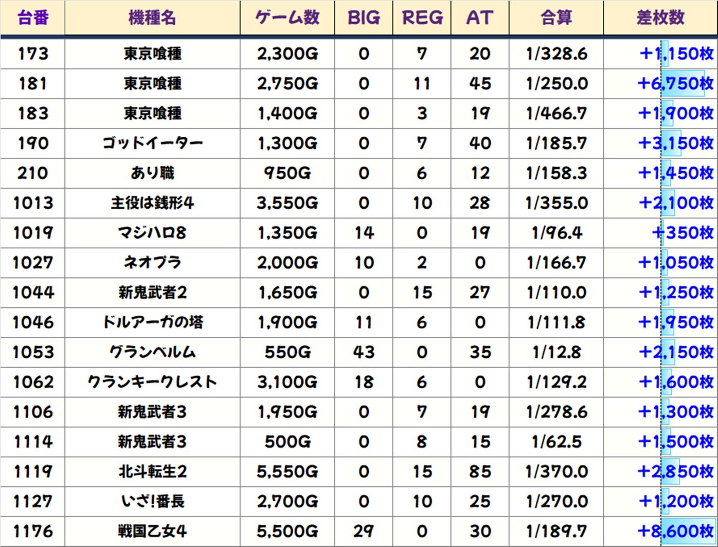 お宝末尾も出現! 今回は【末尾⑧番台】に優秀台多数。【ゴッドイーター】の+17,750枚を筆頭に8台が+3,000枚以上の好成績を収めました。
