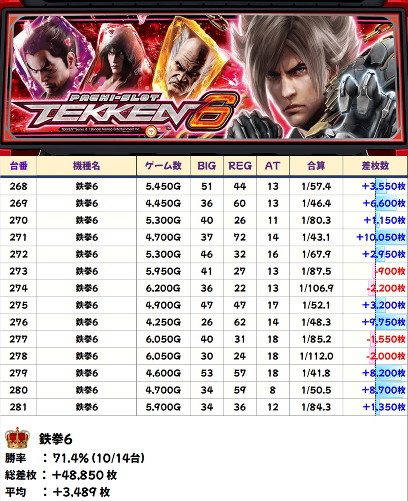 全台系濃厚:鉄拳6(10/14台+) 【平均+3,489枚】