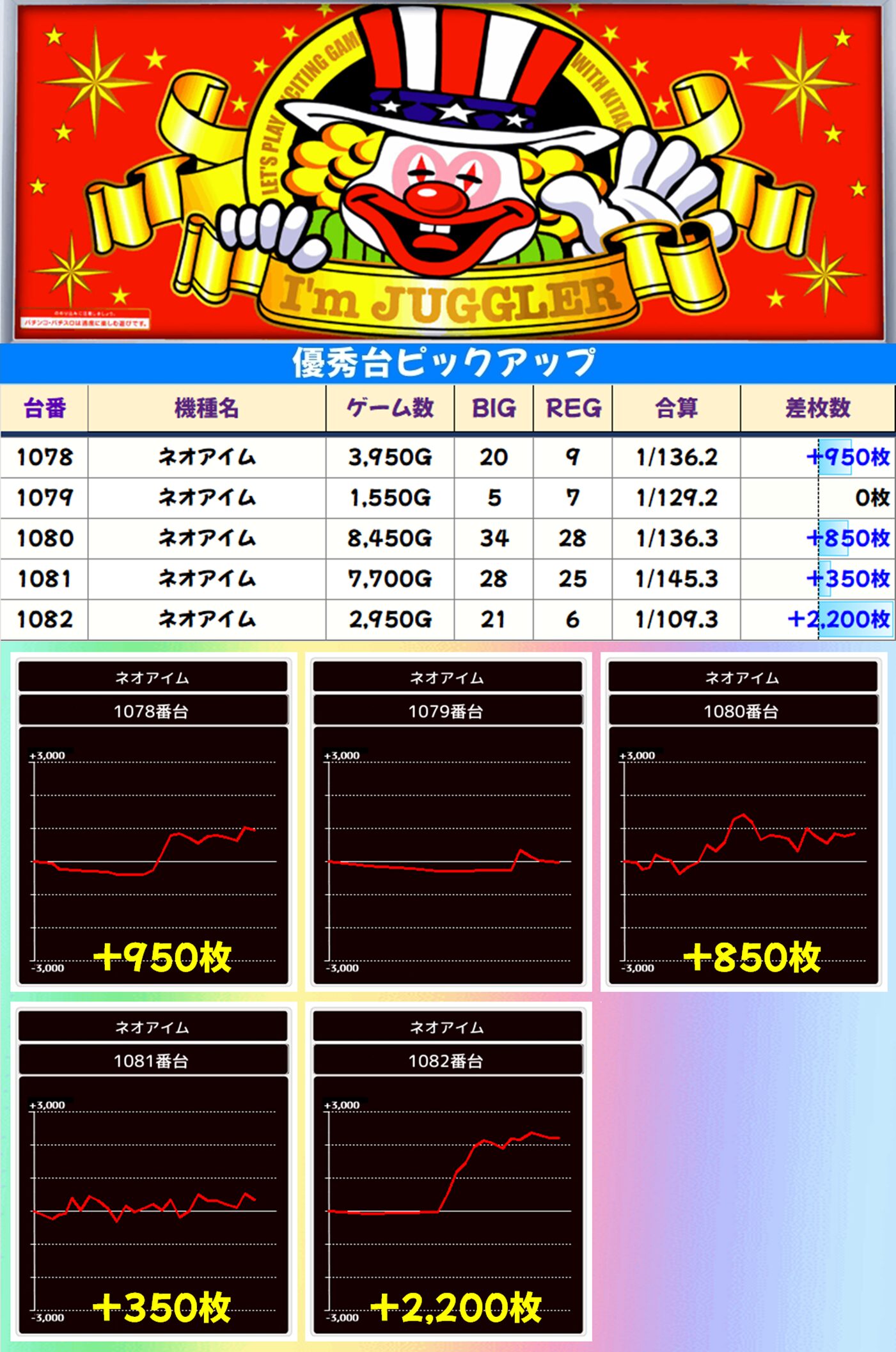 ジャグラーシリーズにもお宝機種が! 本日は【ゴージャグ3】と【ネオアイム】の2機種が高配分。その他のジャグラーにもしっかり高設定が投入されていました。