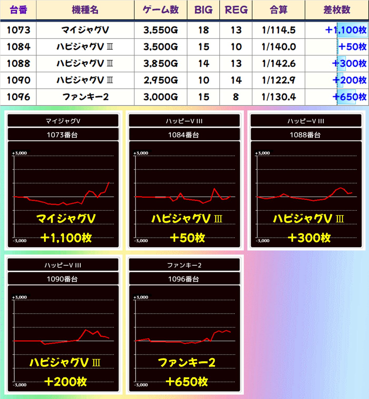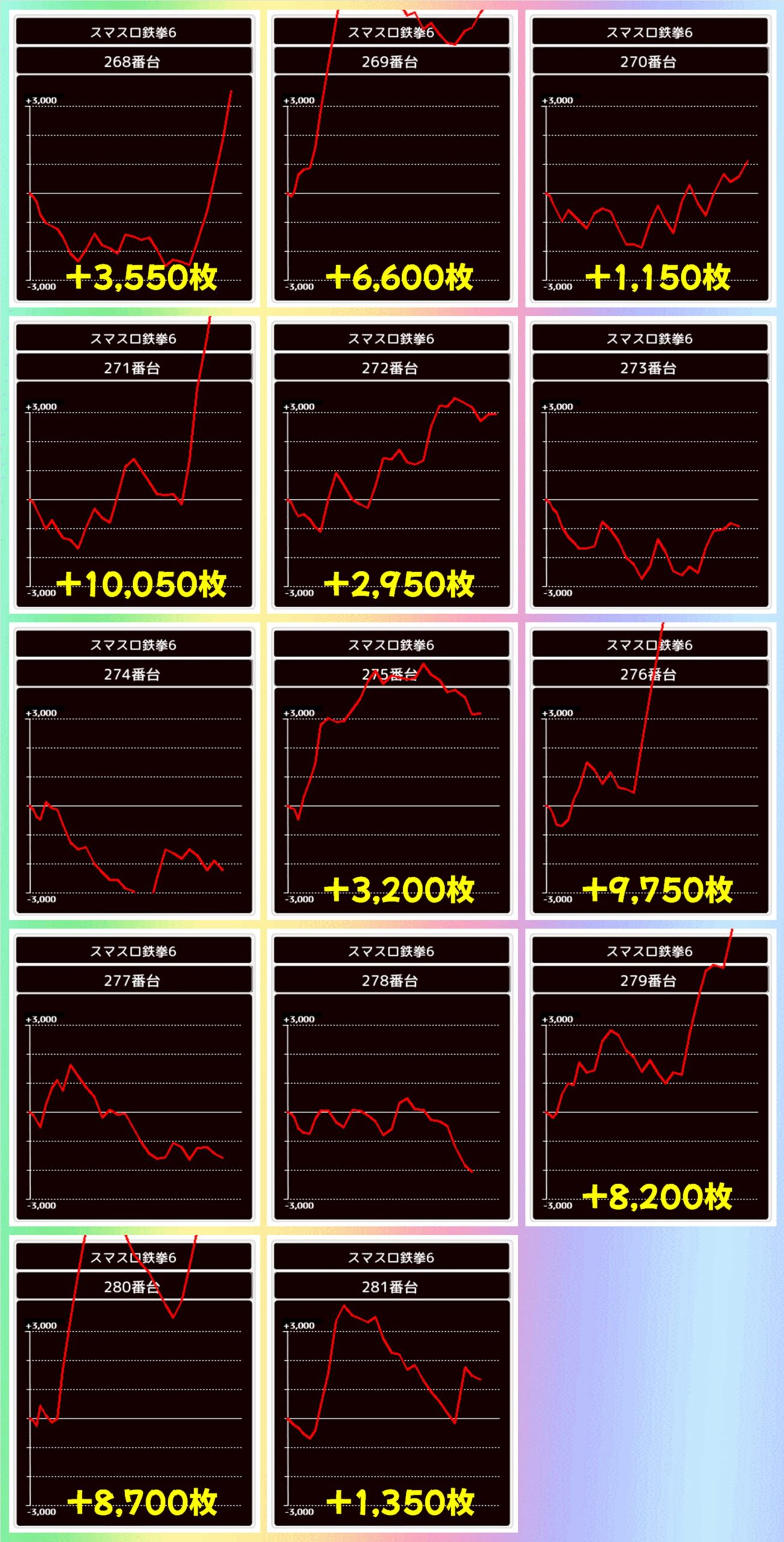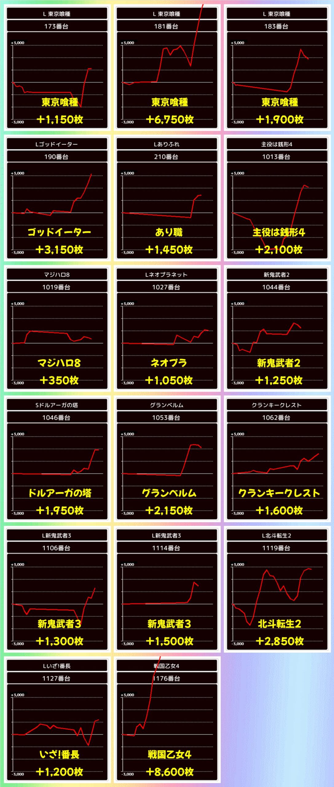 結果は総差枚+48,850枚、平均差枚+3,489枚で14台中10台がプラス差枚。+10,050枚、+9,750枚、+8,700枚、+8,200枚、+6,600枚と大量出玉獲得台が複数出現! お祭り騒ぎの1列になりました。