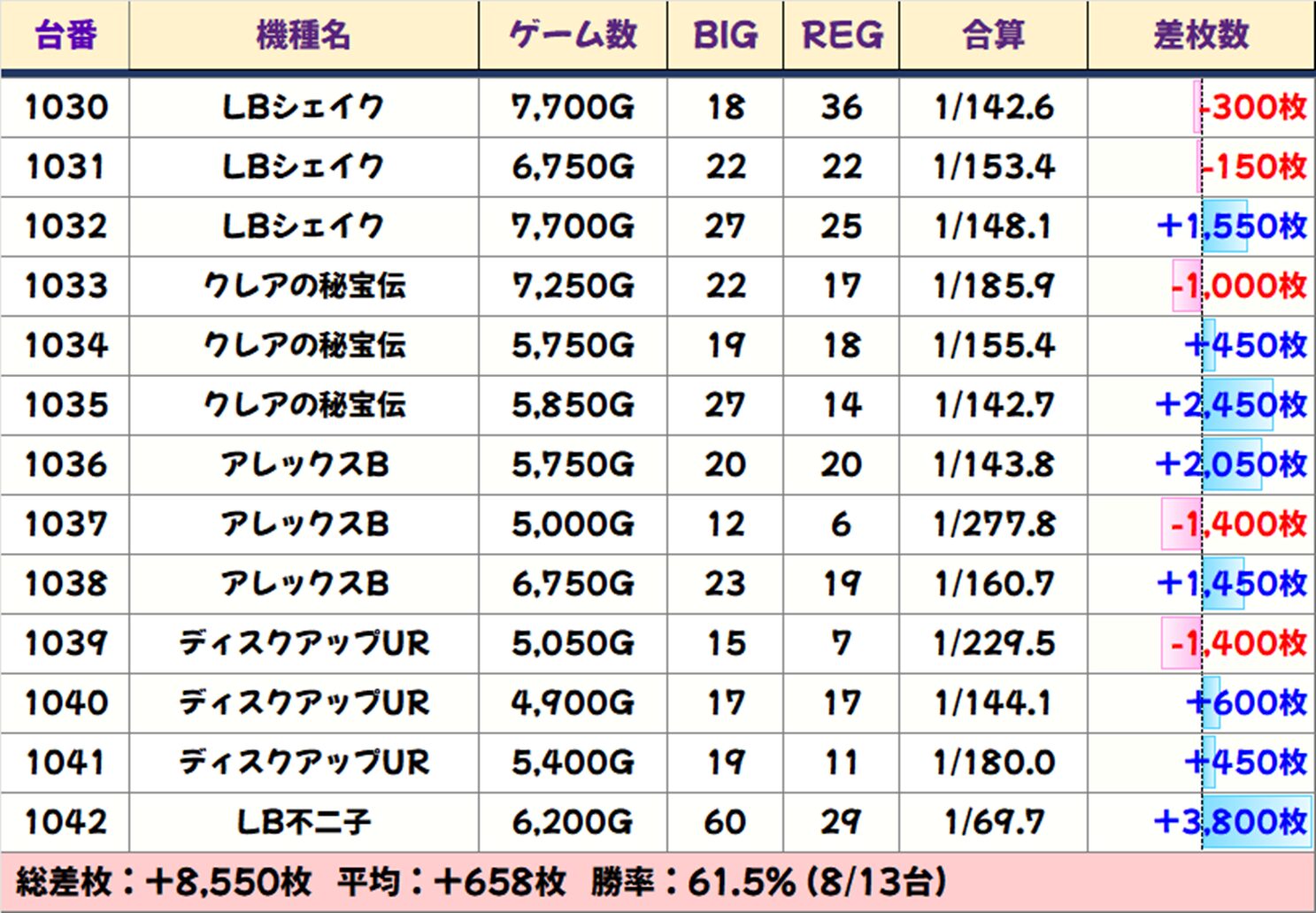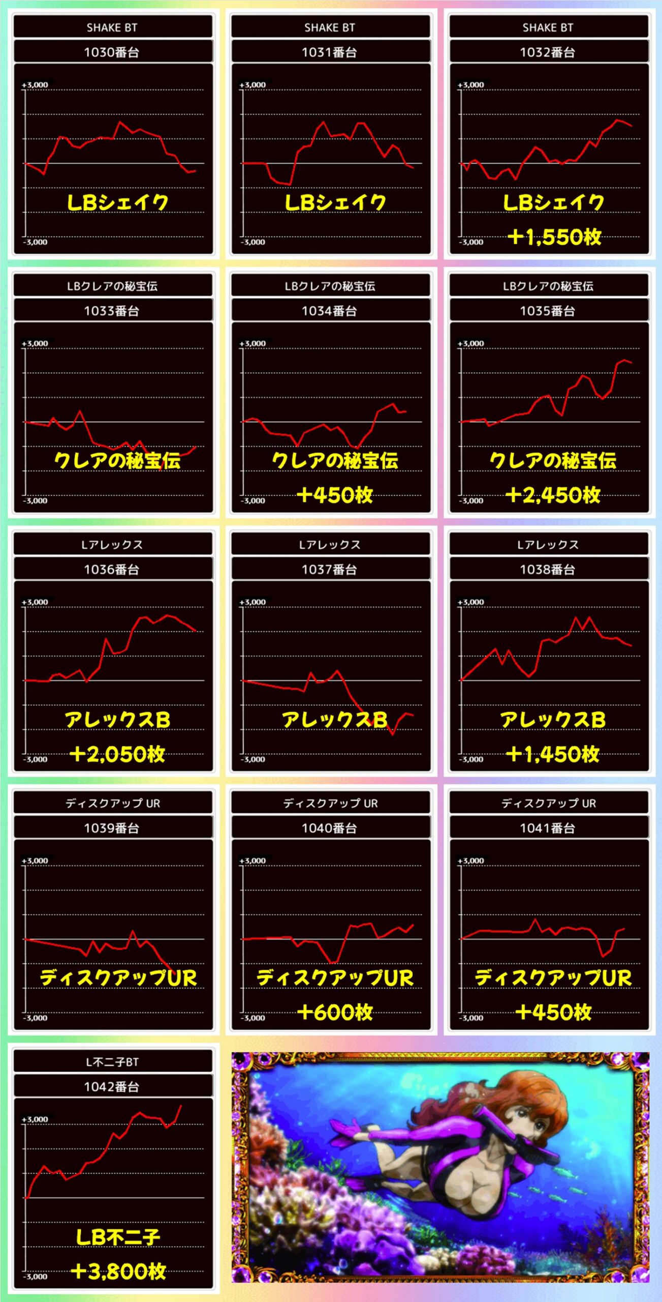 高配分列:シェイク~LB不二子(8/13台+) 【平均+658枚】