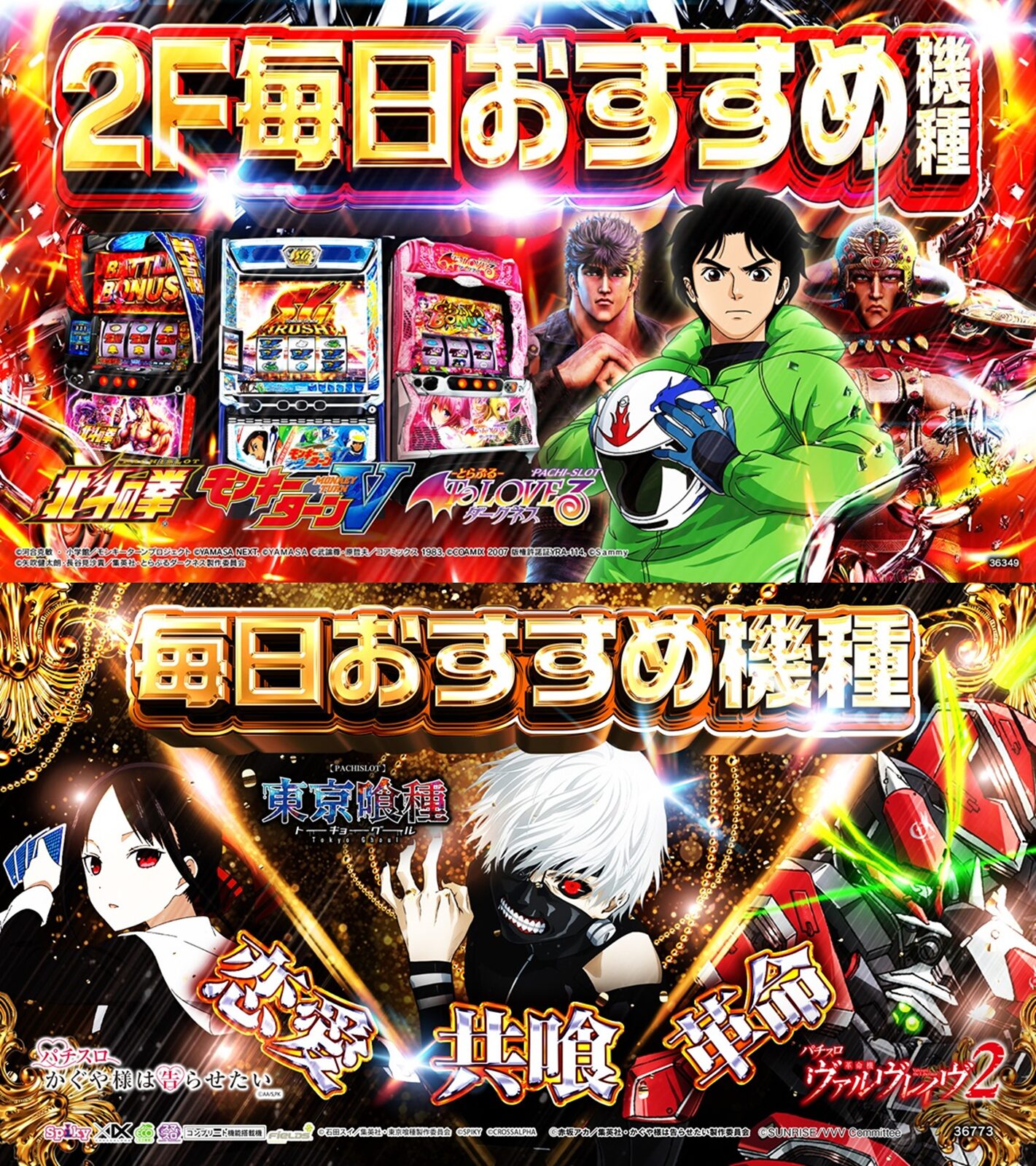 毎日オススメ機種は【スマスロ北斗の拳】【モンキーターンV】【ToLOVEるダークネス】【かぐや様】【東京喰種】【ヴァルヴレイヴ2】の6機種。本日は【ヴァルヴレイヴ2】【モンキーターンV】【東京喰種】の3機種が高配分でしたが、その他の毎日オススメ機種にもお宝台多数! 8のつく日は毎日オススメ機種の期待度がさらにアップしているので、打つ台に迷ったらココを攻めましょう!