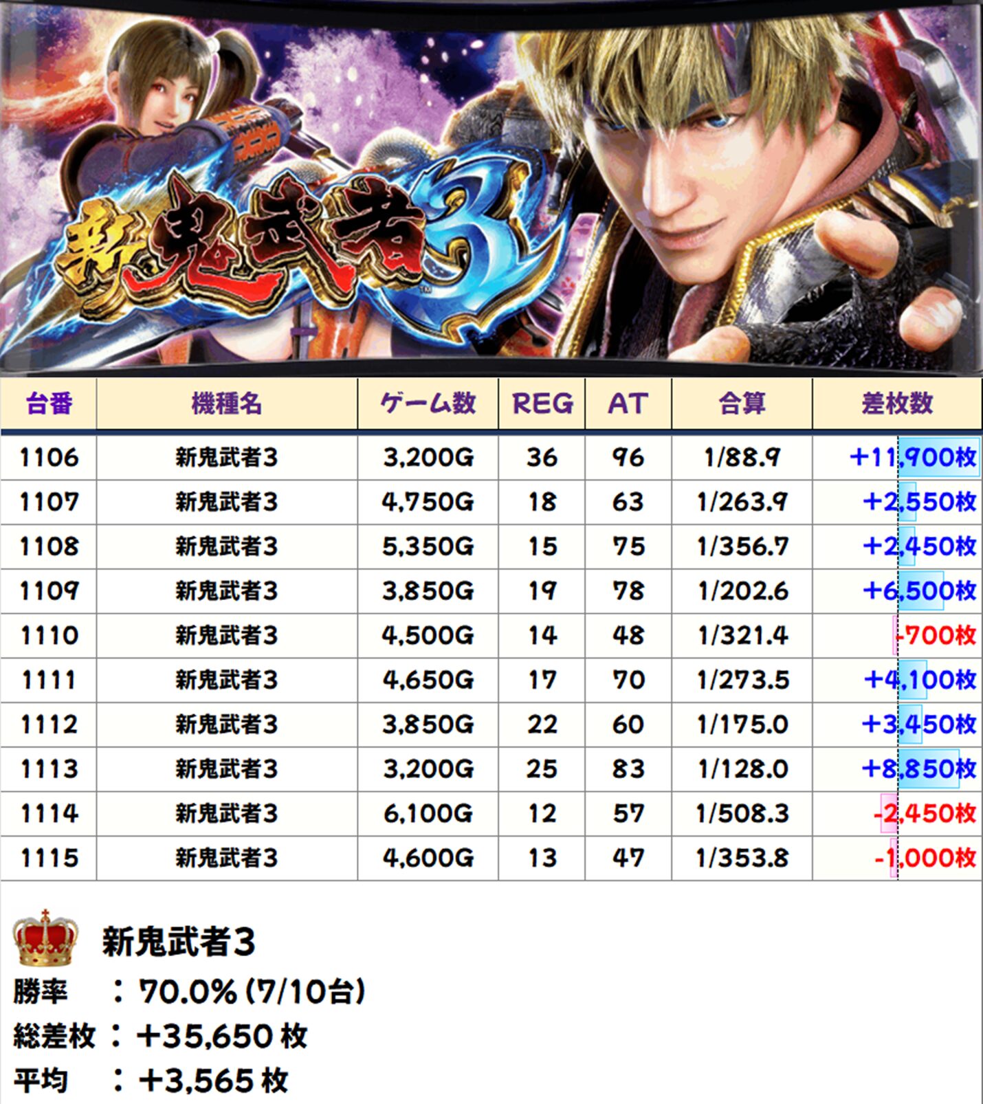 全台系濃厚:新鬼武者3(7/10台+) 【平均+3,565枚】