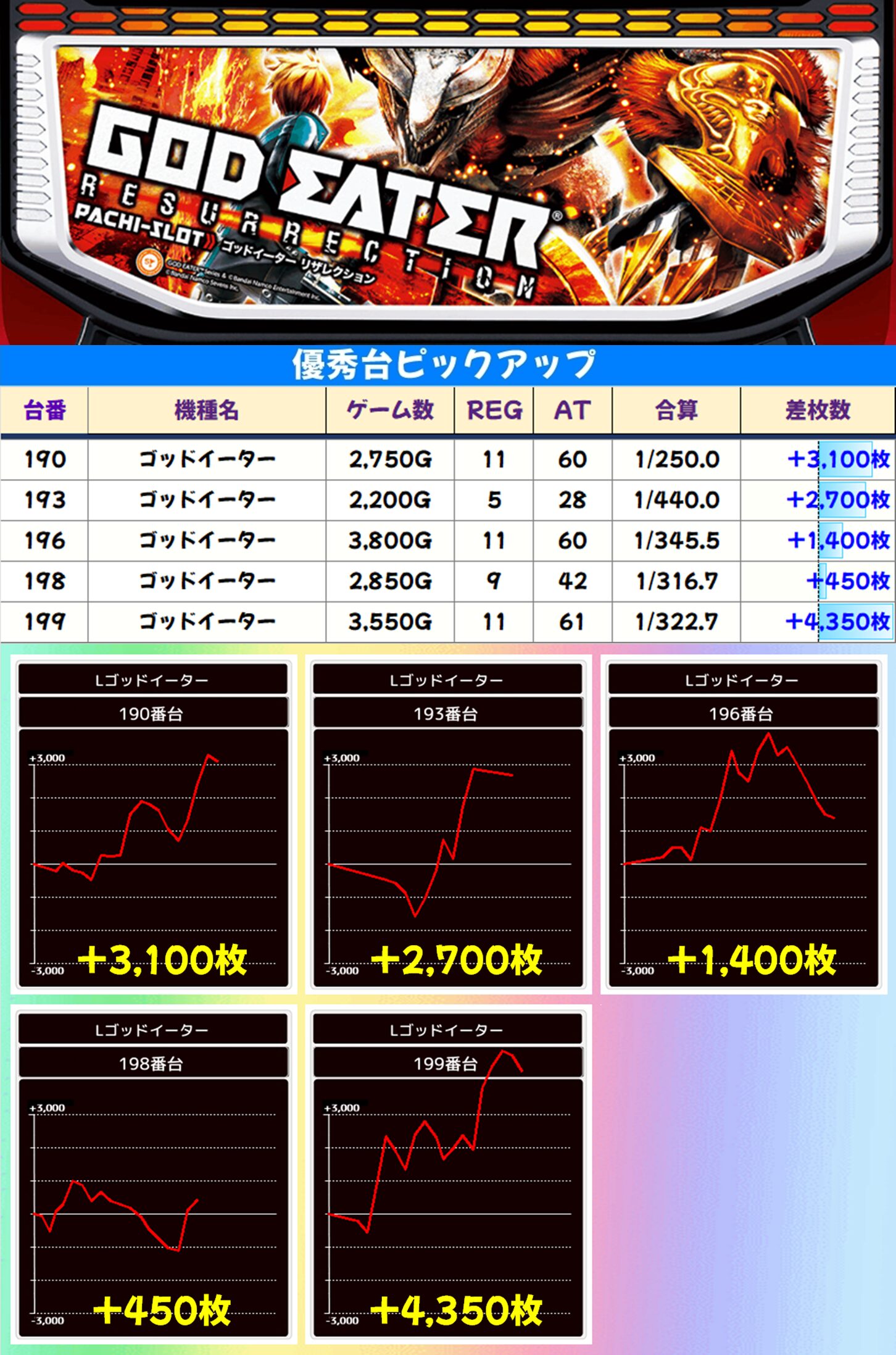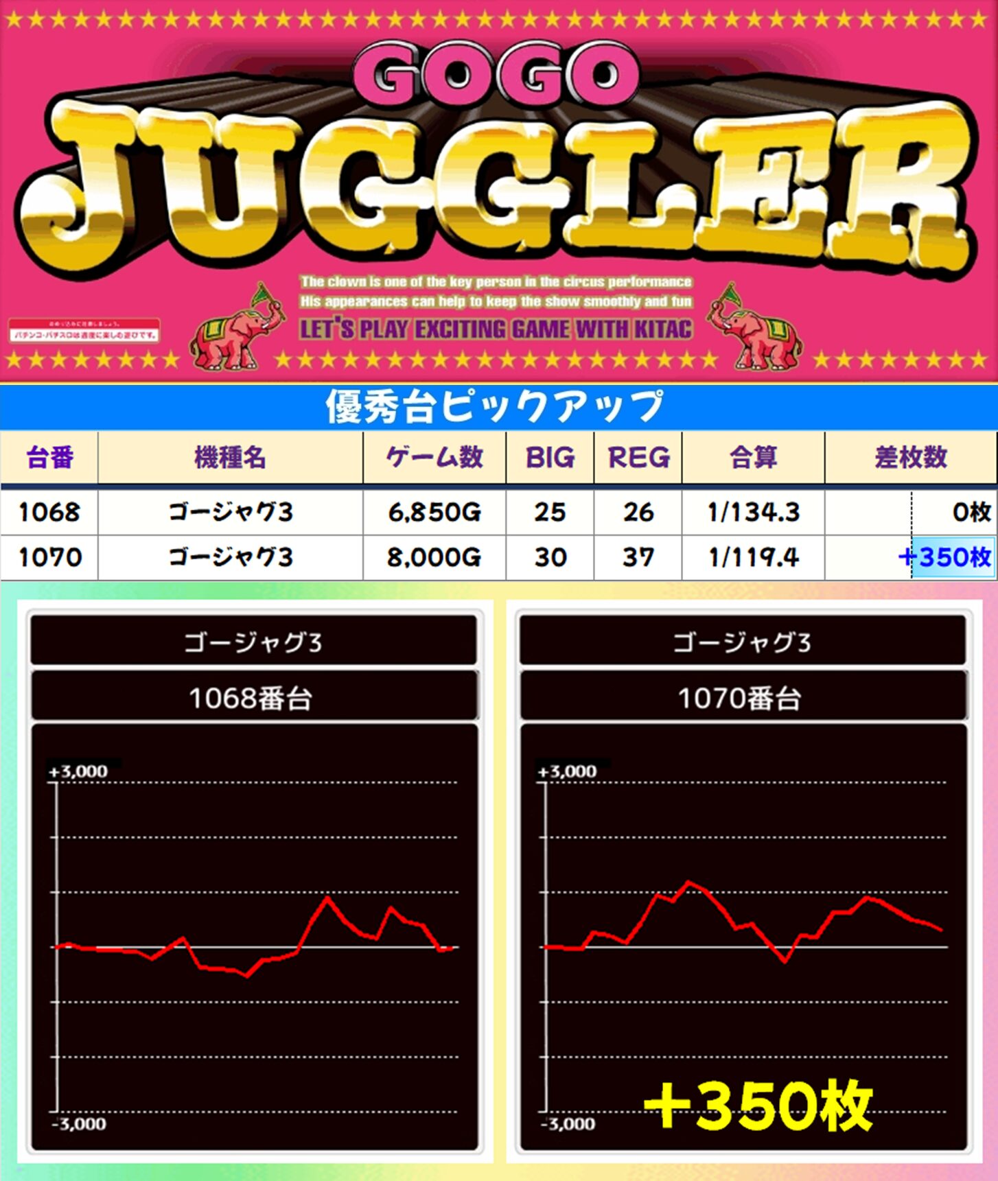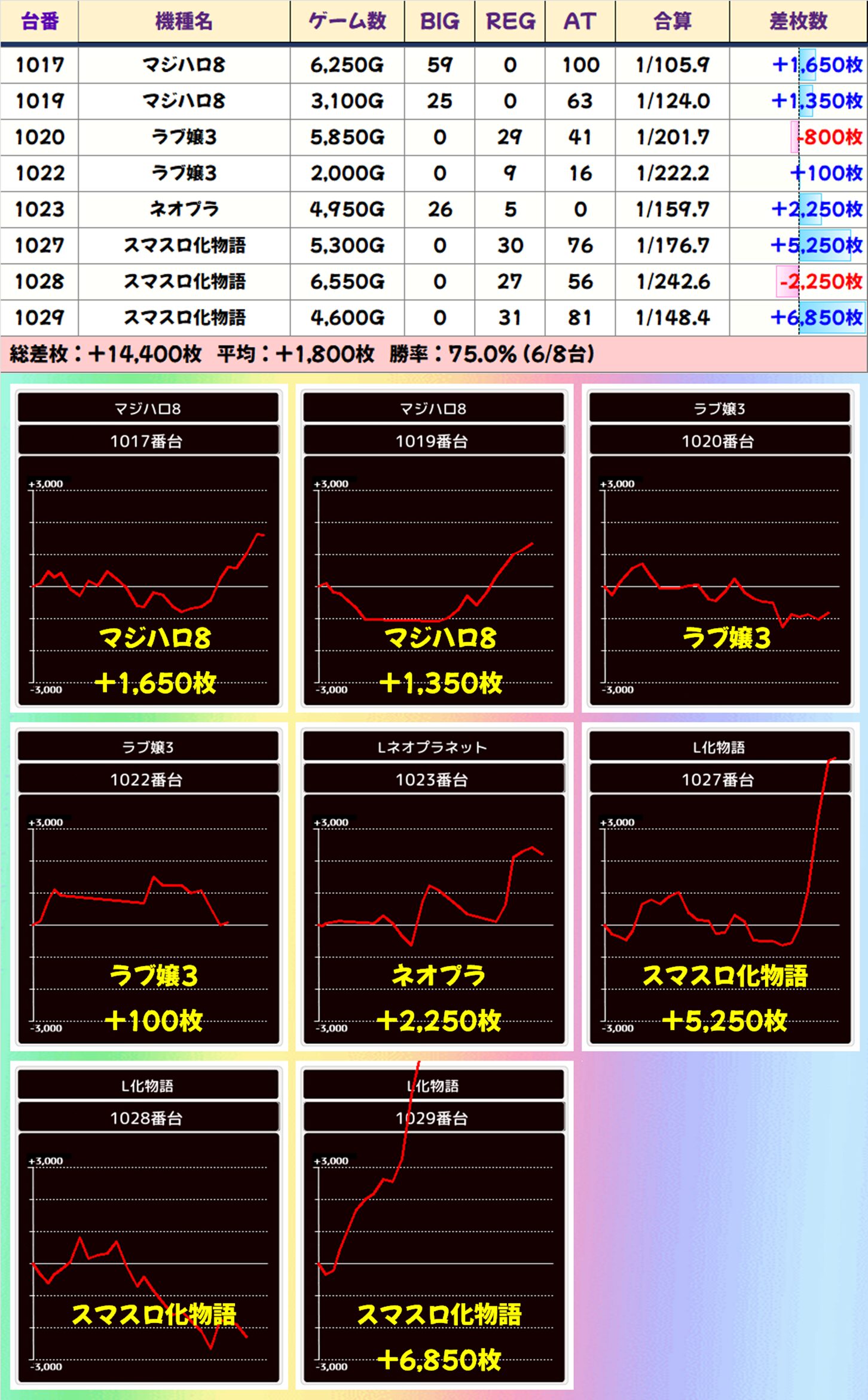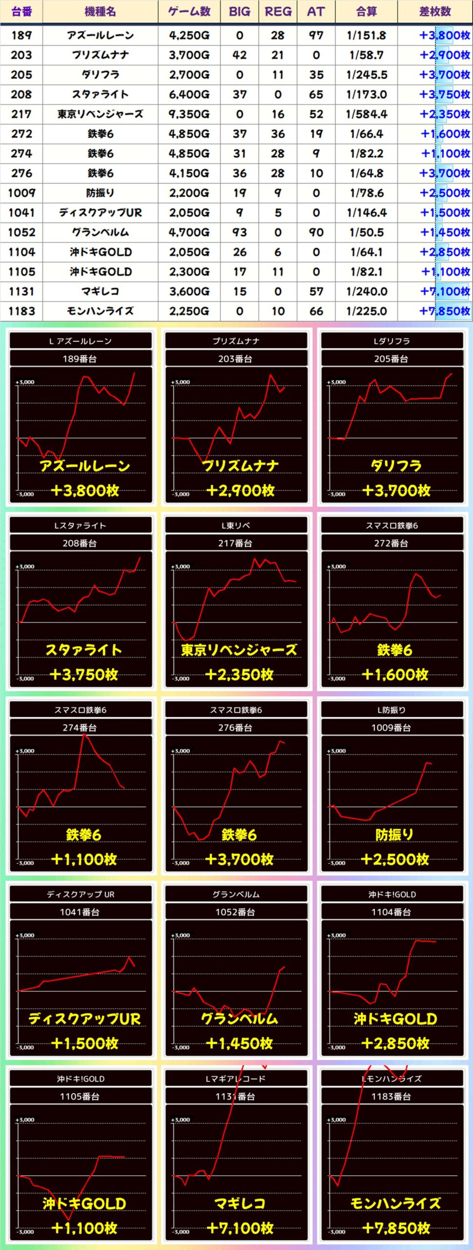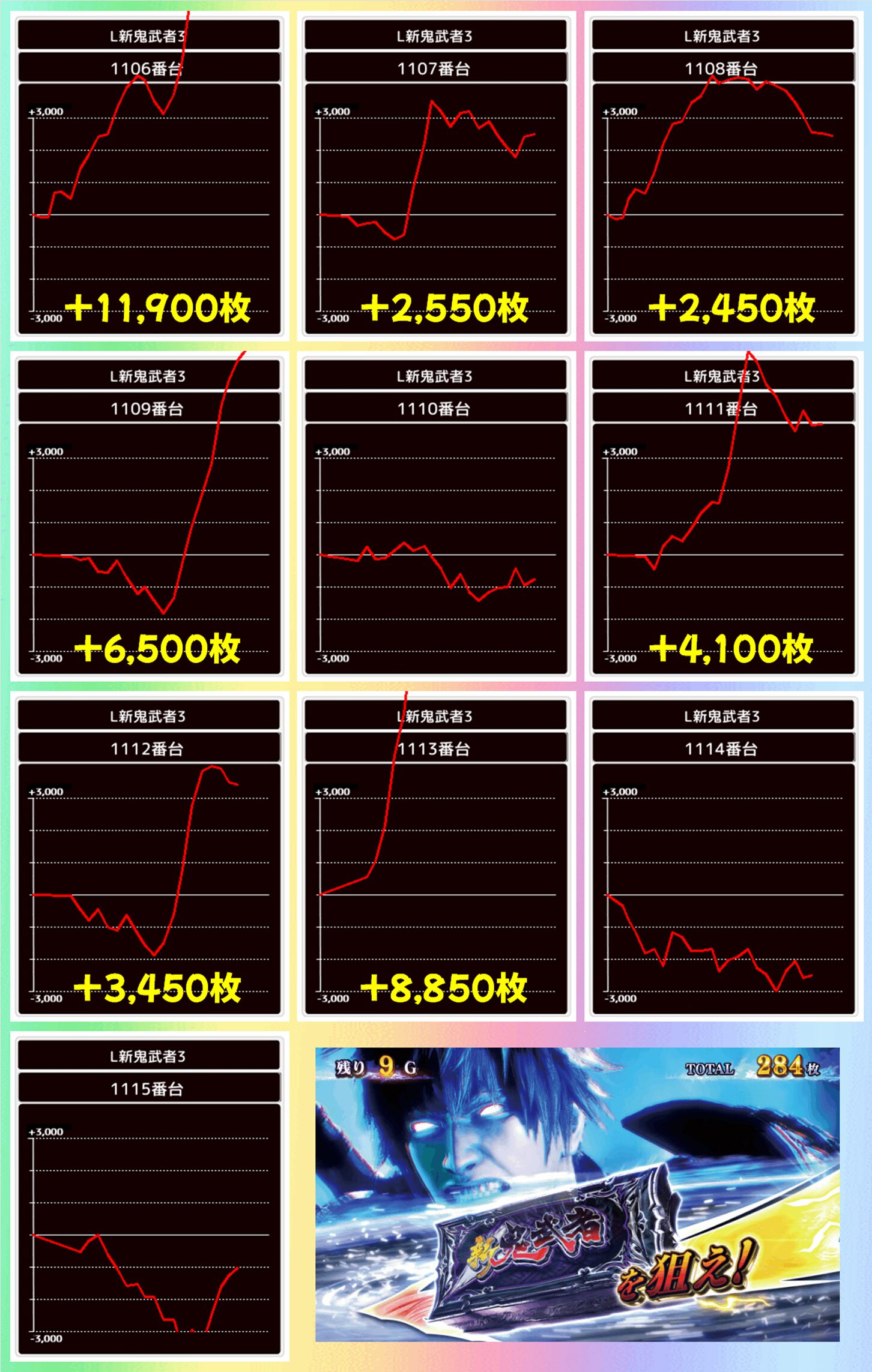 結果は総差枚+35,650枚、平均差枚+3,565枚で10台中7台がプラス差枚。+11,900枚、+8,850枚、+6,500枚、+4,100枚、+3,450枚、+2,550枚、+2,450枚とプラスの7台は全て大量出玉を獲得したので、お宝台の質もよかったと思われます。