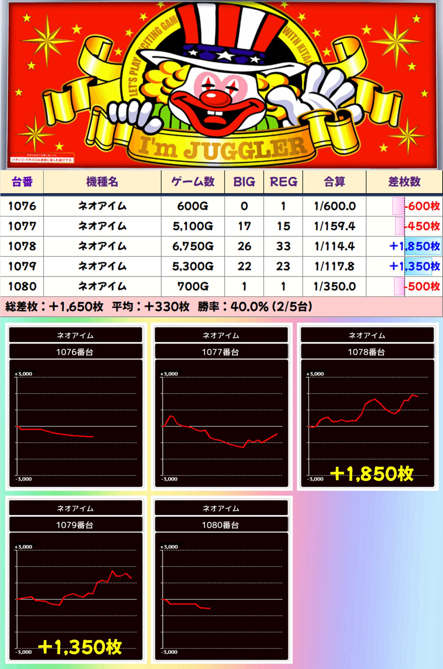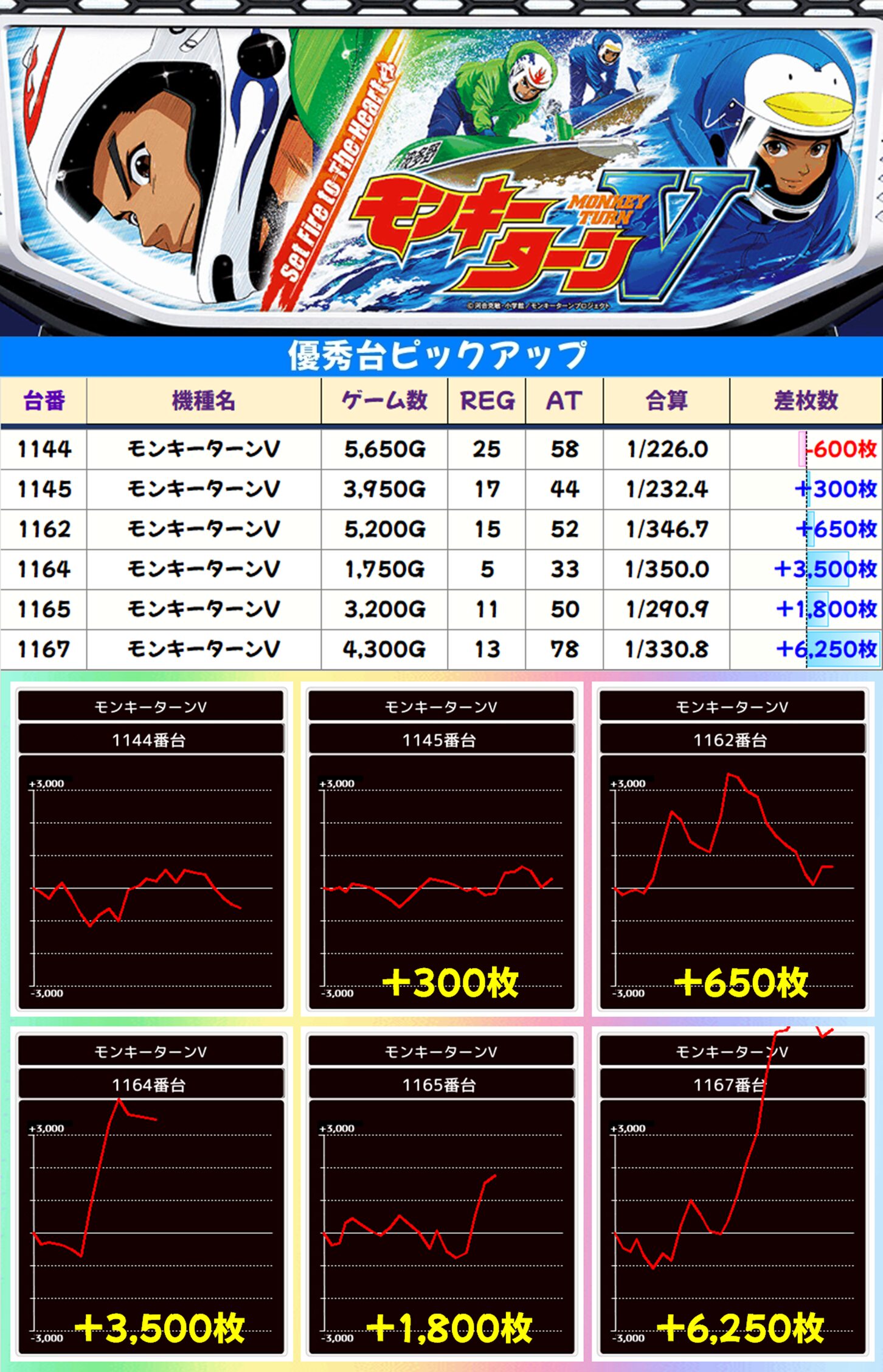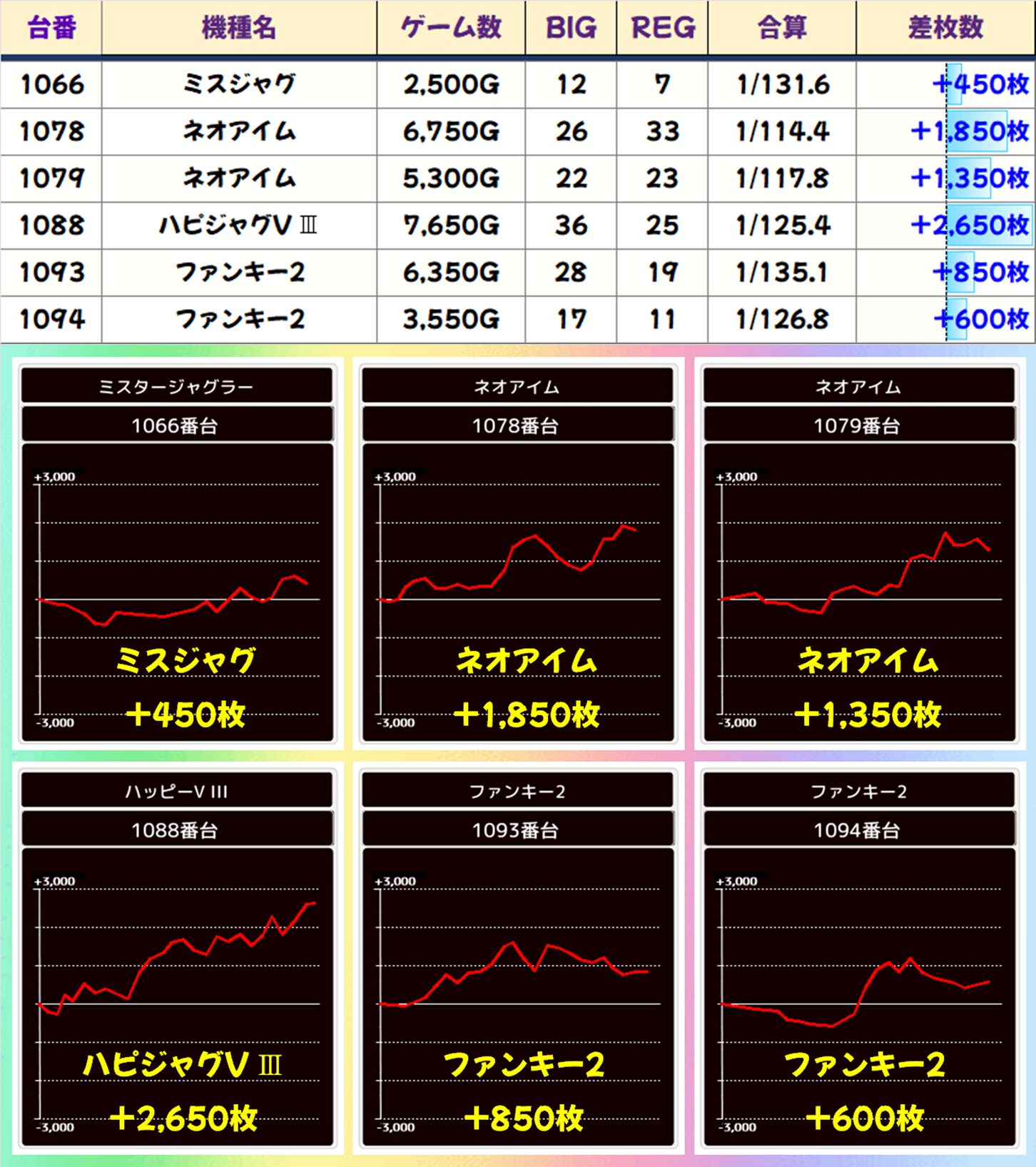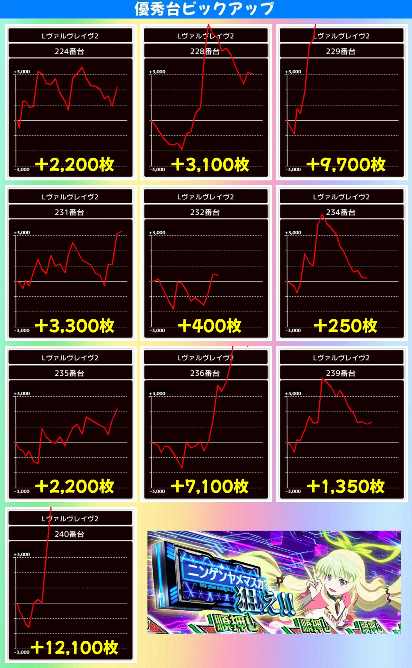 ちなみに、5台設置の【ヴァルヴレイヴ】、5台列の【ネオアイム】に優秀台が多数あったので、やはり「午後→5、5」がヒントだった? この予想があっているかはわかりませんが、MJ店長のポストは毎回チェックして損はないと思いますよ。