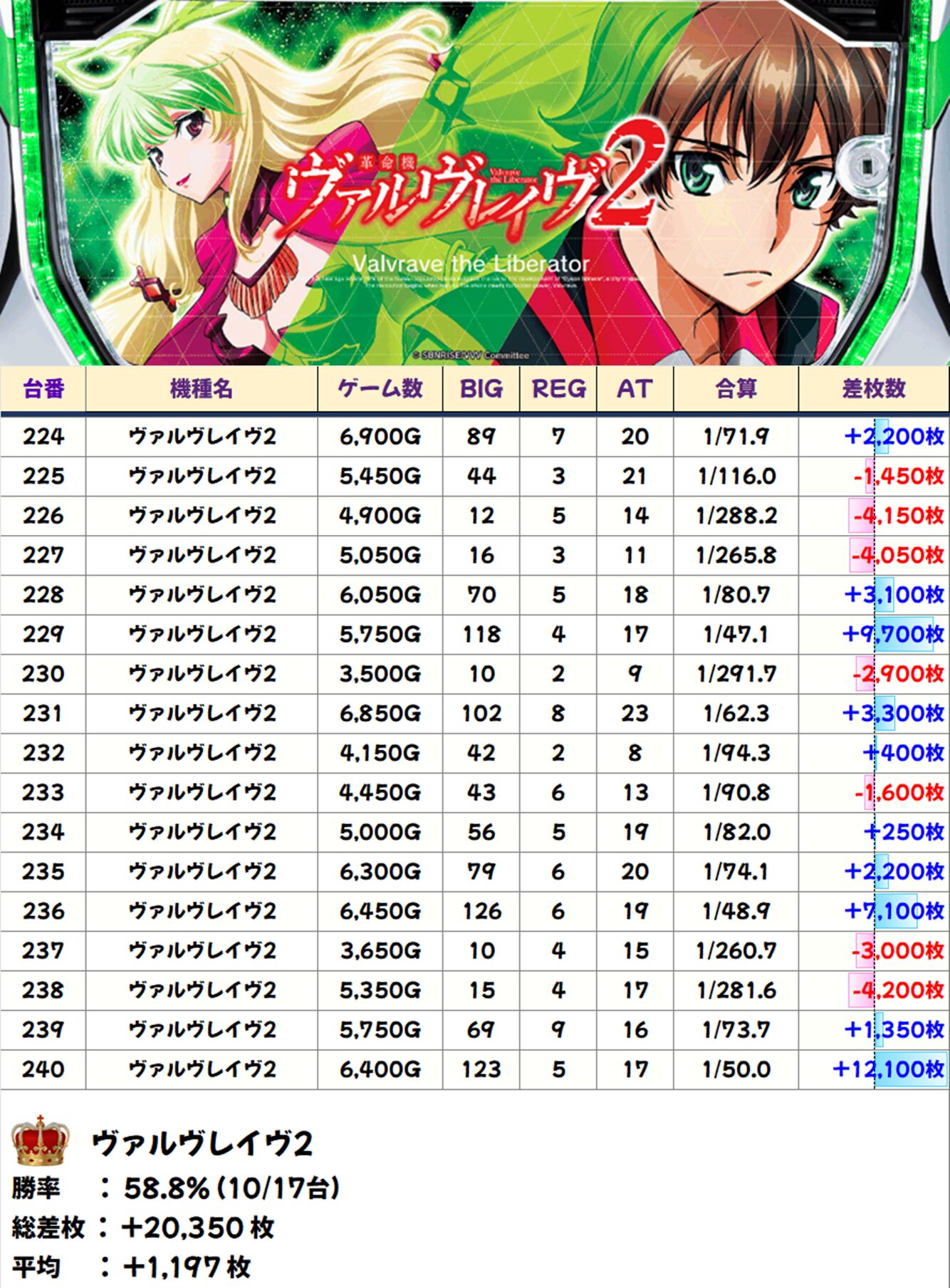 高配分列:ヴァルヴレイヴ2(10/17台+) 【平均+1,197枚】