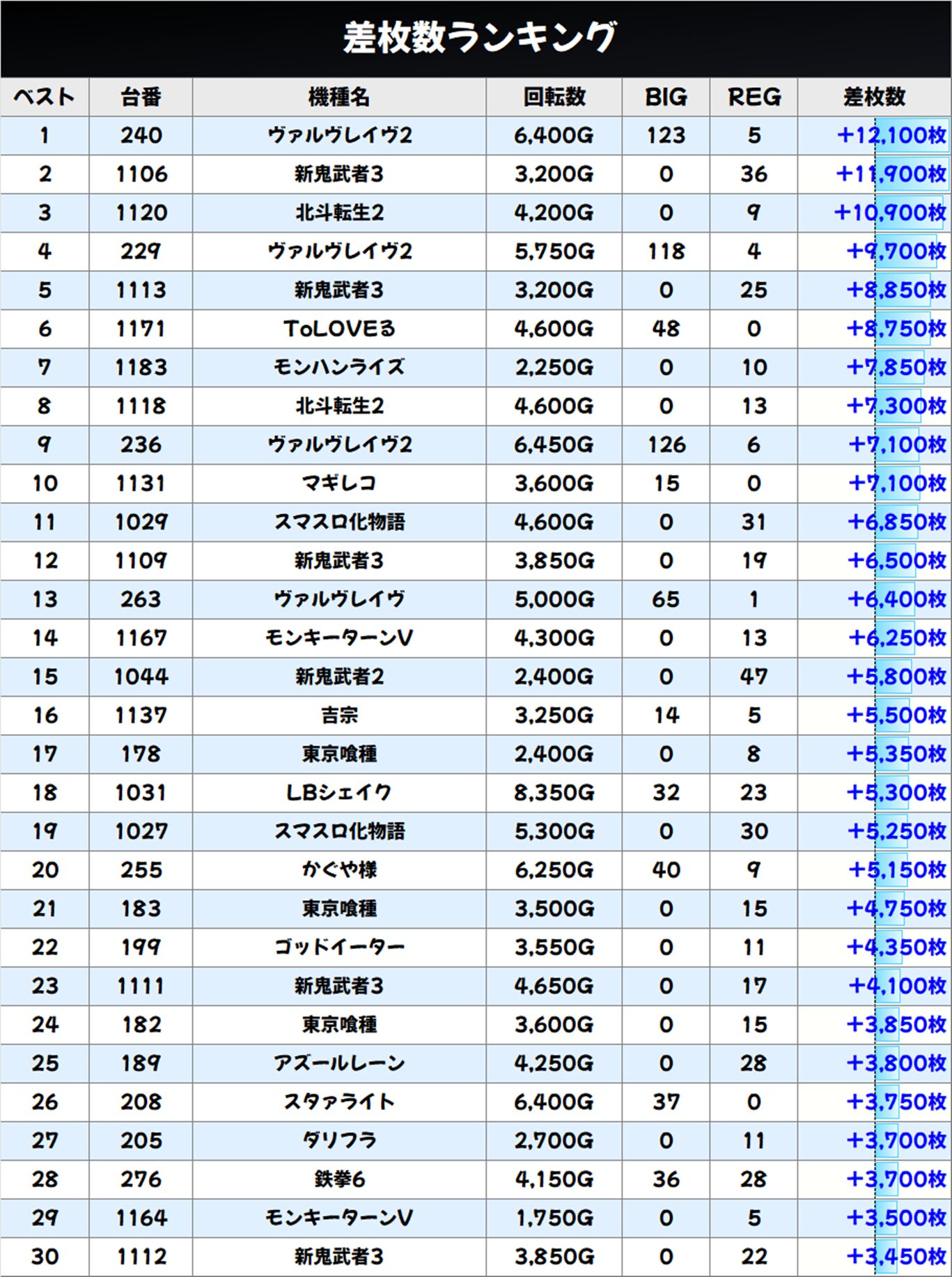 高品質な高配分機種だったので爆発台も多数出現! 最新台の【北斗転生2】から+10,900枚、+7,300枚、【モンキーターンV】から+6,250枚、【吉宗】から+5,500枚、【東京喰種】から+5,350枚、+4,750枚、【LBシェイク】から+5,300枚、【ゴッドイーター】から+4,350枚と各機種から大量出玉が炸裂しました!