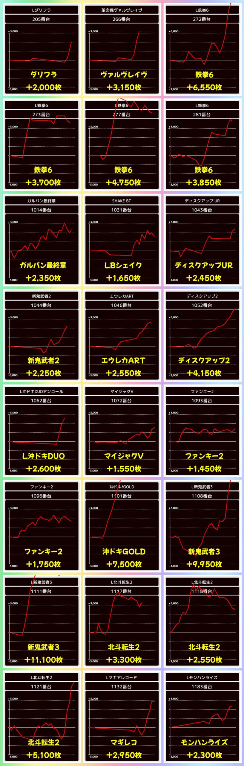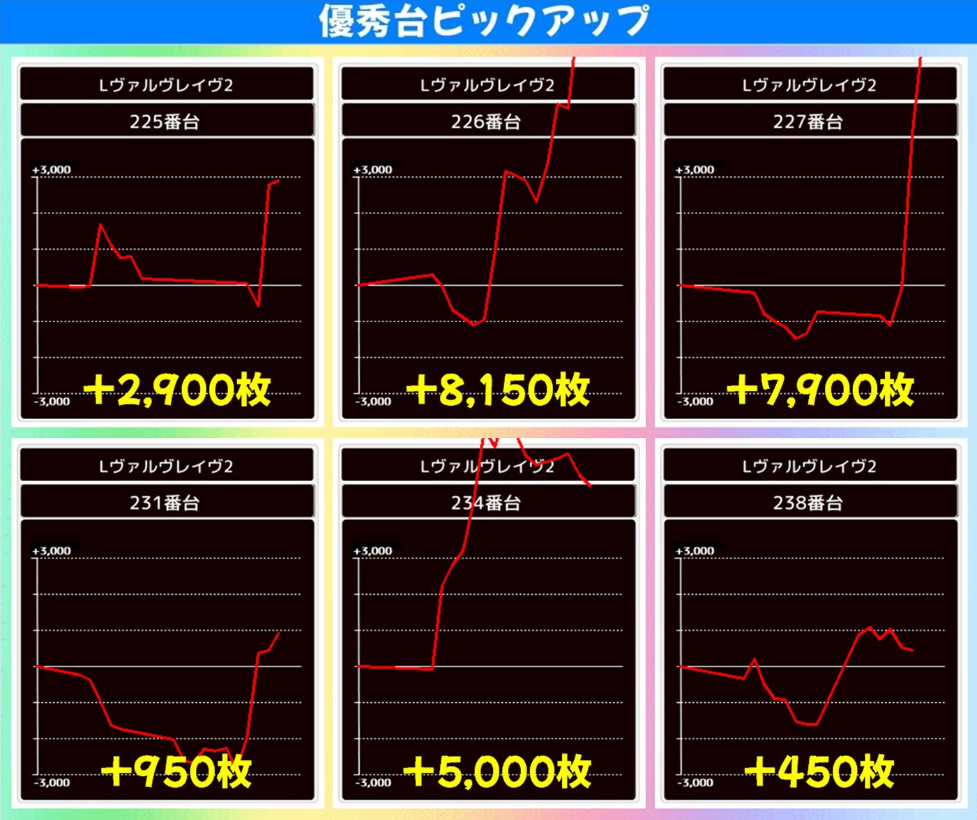 出玉力のある【ヴァルヴレイヴ2】なので大爆発台も複数出現! +8,150枚、+7,900枚、+5,000枚と3台が大量出玉を獲得して勝利を収めました!