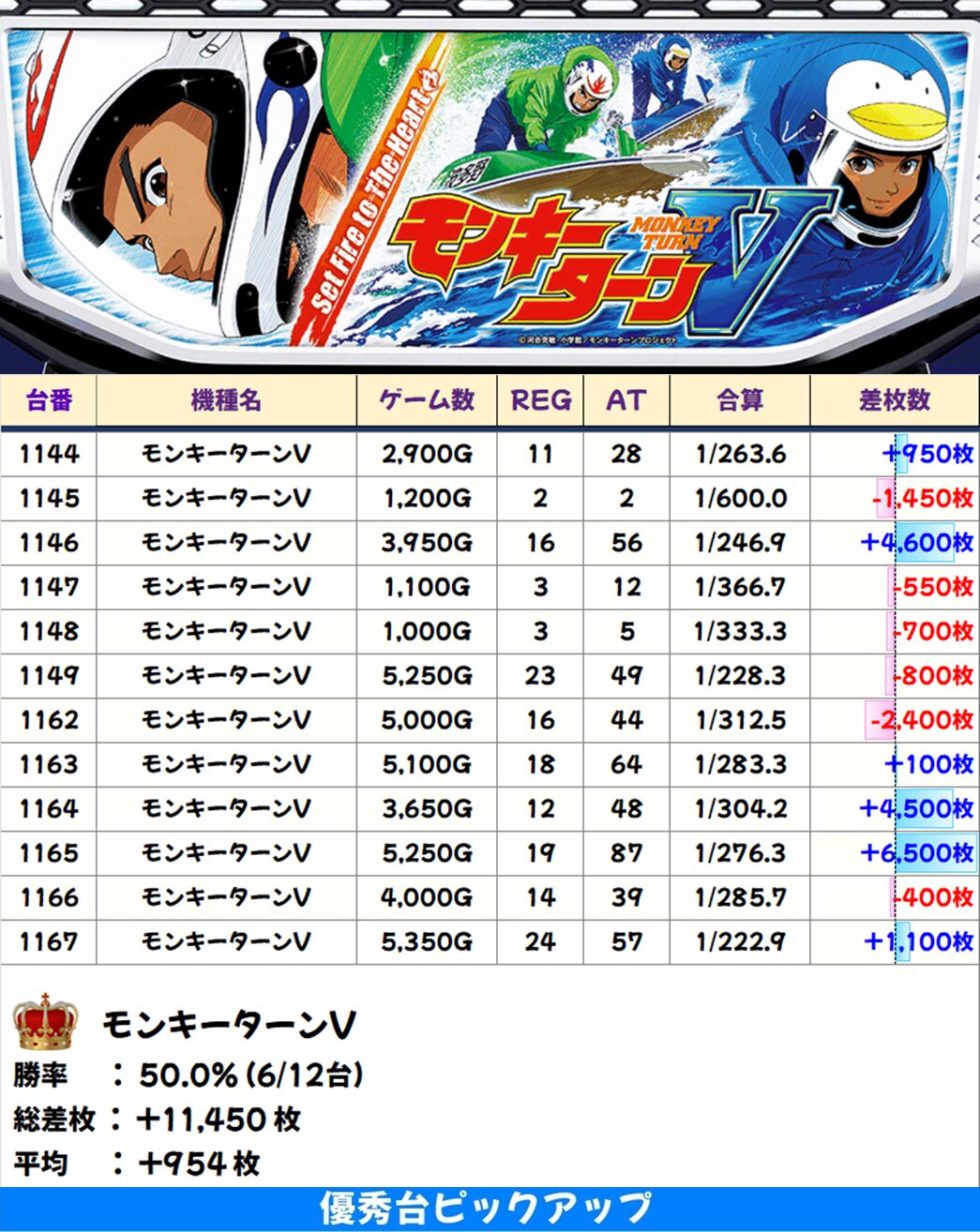 高配分:モンキーターンV(6/12台+)【平均+954枚】