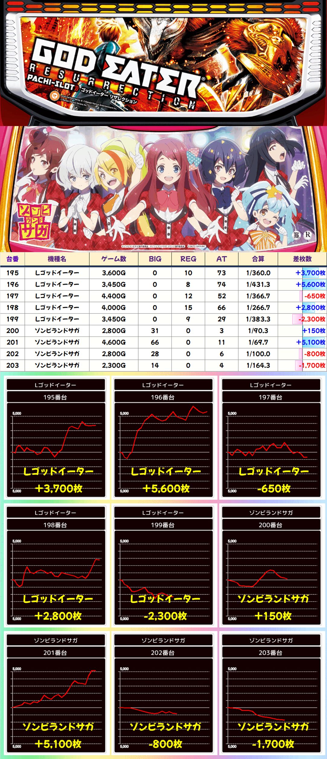 全系9台並び:ゴッドイーター&ゾンサガ(5/9台+)【平均+1,322枚】
