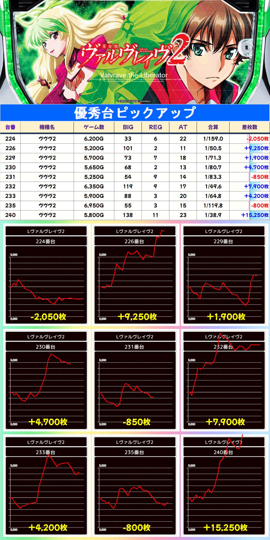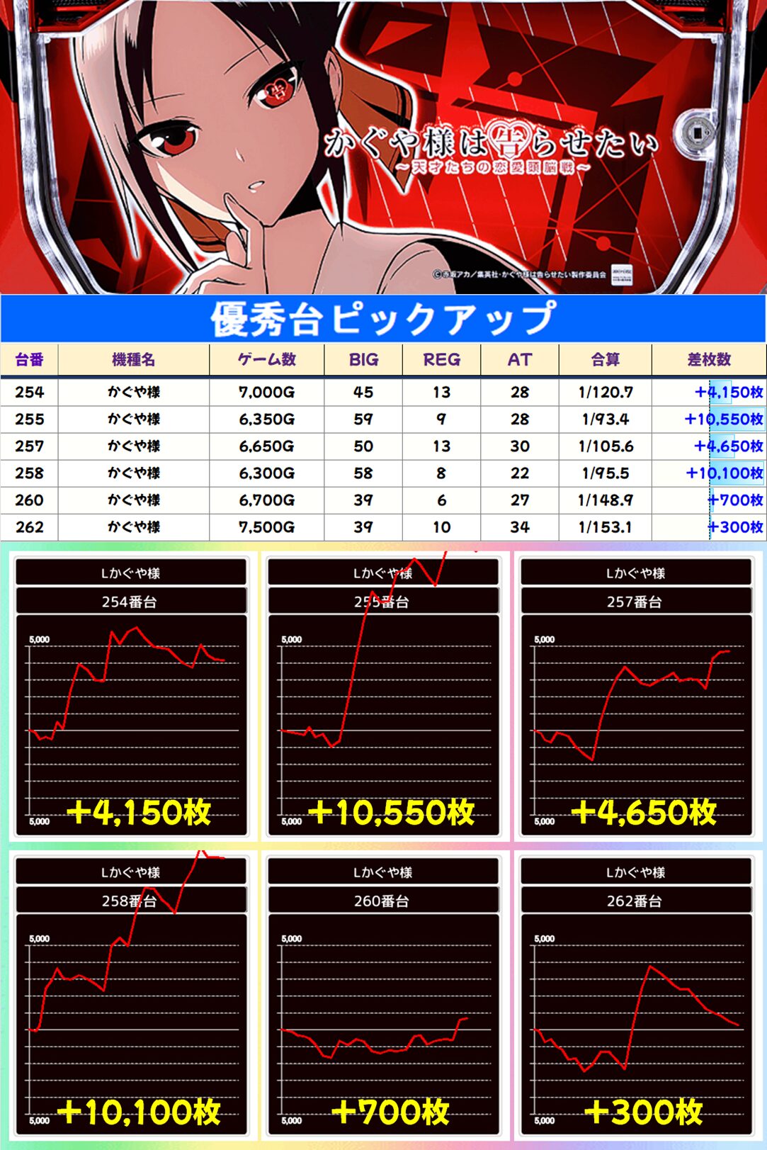 万枚overがヴヴヴ2に1台、かぐや様からは2台確認。その他、大量出玉も複数あり。