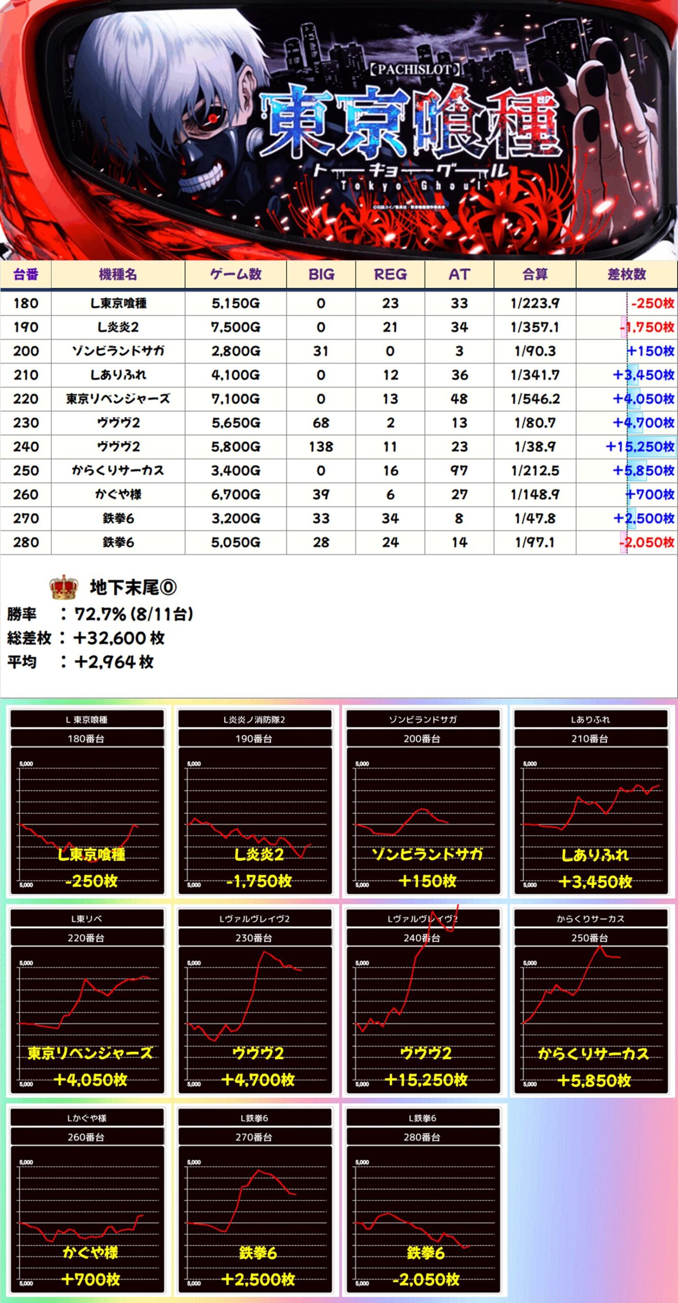 11台中8台プラス(勝率73%)平均+2,964枚となりました。