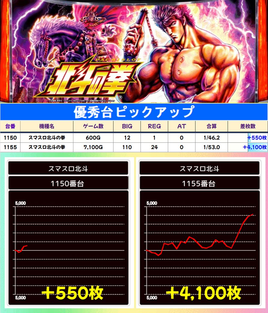 単品優秀台もしっかり出現し、中には【スマスロ北斗1156番・からくり241番】優秀角台(兎に角)も存在。