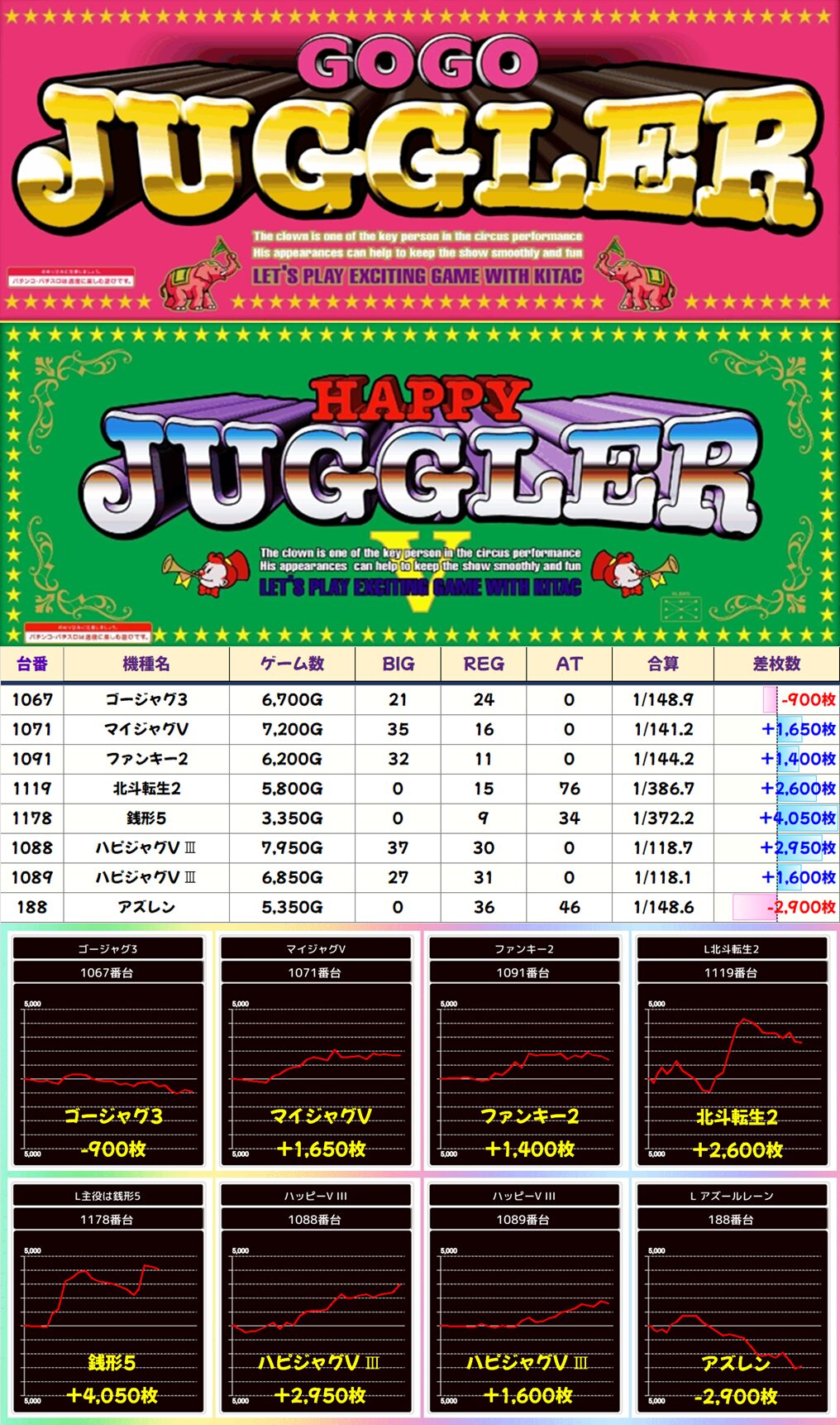 今回の8つく結果は万枚5件、 多台数並び・全台系や機種高配分・末尾など多数あった結果に!!