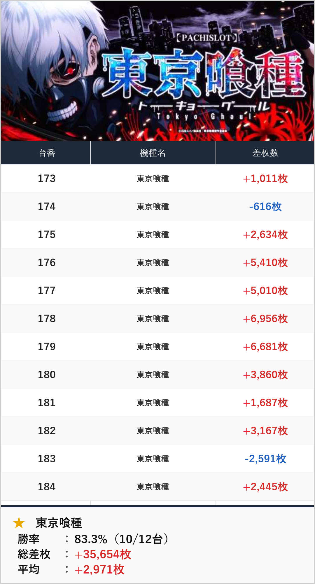 全台系:東京喰種(173-184番台)【平均+2,971枚】