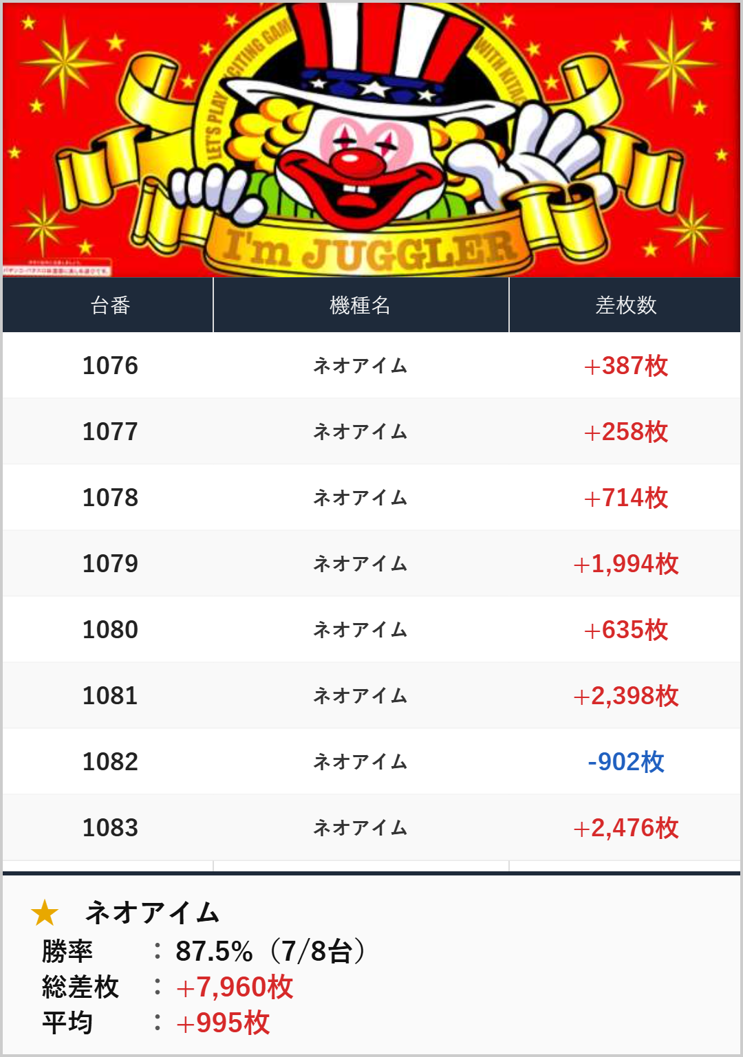 全台系:ネオアイム(1076-1083番台)【平均+995枚】